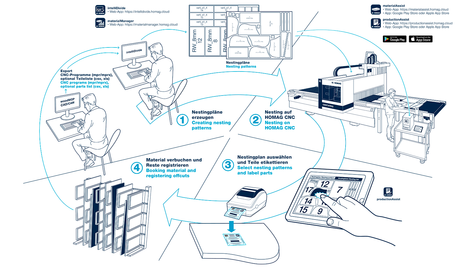 The following components are included in the scope of delivery:- Four apps: intelliDivide Nesting (Optimization software for nesting plans), productionAssist Nesting (digital assistant in production the labeling of nested components), materialManager (central material management) & materialAssist Boards (management of boards and offcuts at the workplace in production)