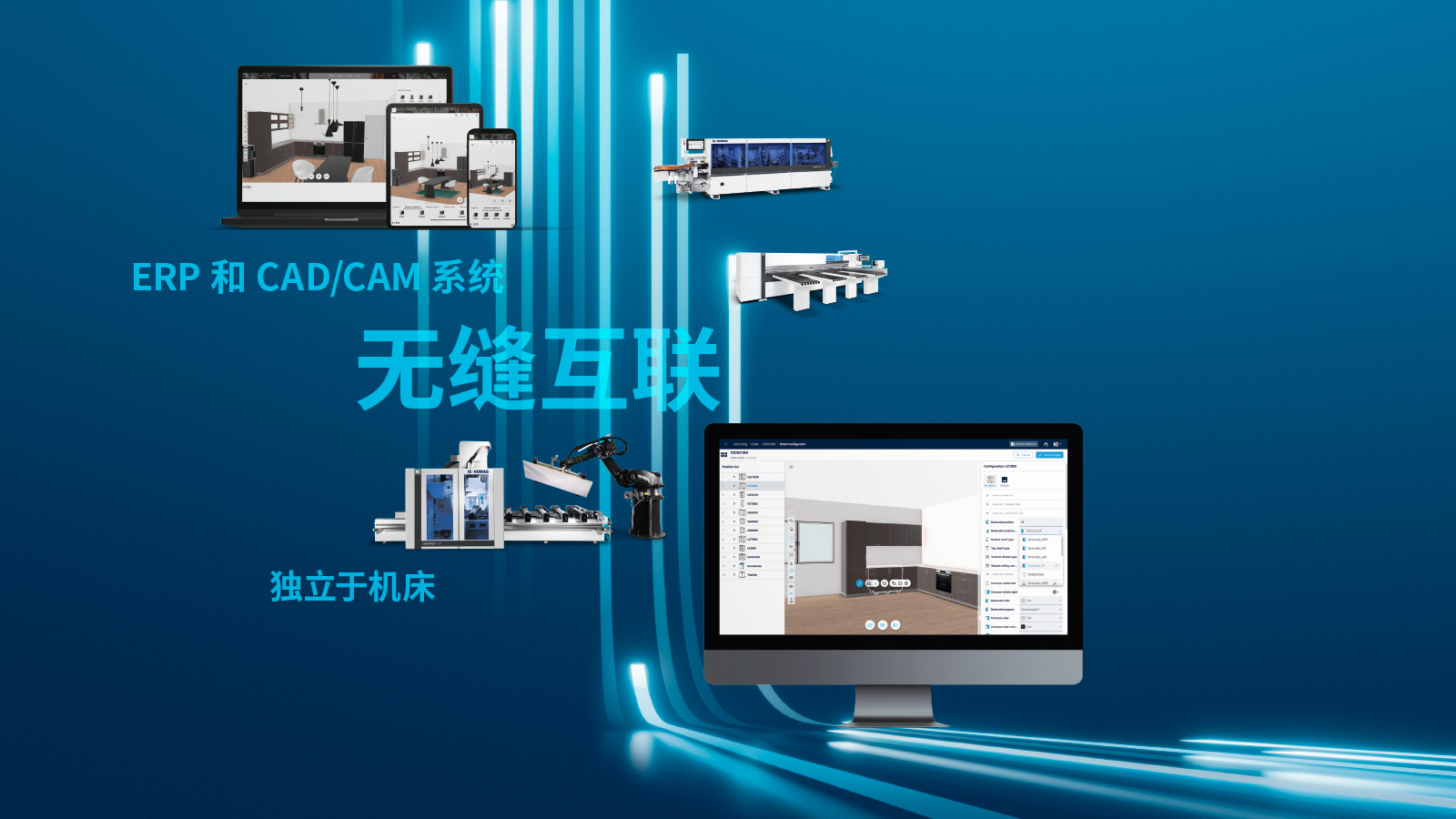 通过使用最新技术(云端集中数据存储、人工智能),HOMAG 凭借 HOMAG INTELLIGENCE 助力企业领跑未来。基于云端的平台为此提供了稳定的基础:数据在平台中进行处理,然后传输至其他软件系统、流程环节和机床设备。