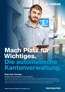 Edge Data Package består af kantbåndsassistenten og en HOMAG-kantlimemaskine med maskinsoftwaren woodCommander 5. Kantbåndsassistenten og maskinen er forbundet med hinanden via et plugin. Med netværksforbindelsen mellem maskine og digital løsning får du dermed yderligere fordele, der gør kantbåndsadministrationen endnu mere effektiv og enkel.