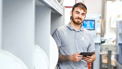 - Det første skridt er forberedelsen af arbejdet. Først skal du oprette dit kantmateriale og dine kantdata i web-appen materialManager – eller du kan nemt importere dem. I materialManager styrer du det komplette materiale centralt for din virksomhed. Appen viser dig altid det aktuelle lager og hvor du kan finde hvilken rulle. I produktionen kan du opmagasinere dine kantruller på kantreolen og gemme disse oplysninger i appen materialAssist på din tablet. Således kan du nu nemt hente alle oplysninger om hvert kantbånd (egenskaber, restlængde). På samme enkle måde kan du printe de tilsvarende etiketter (indeholder ID, kantkode og kantbåndets mål) til mærkning af kantbåndene.