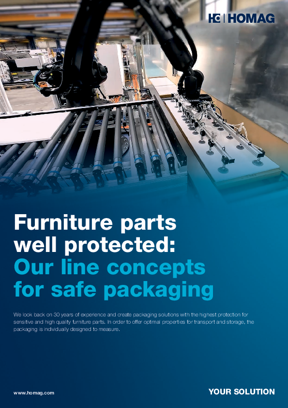 The line reproduces the complete process of automated furniture packaging from folding of the cardboard box in FEFCO 0410 design, insertion of the workpieces and filling material to automatic closing, gluing and stacking of the boxes.