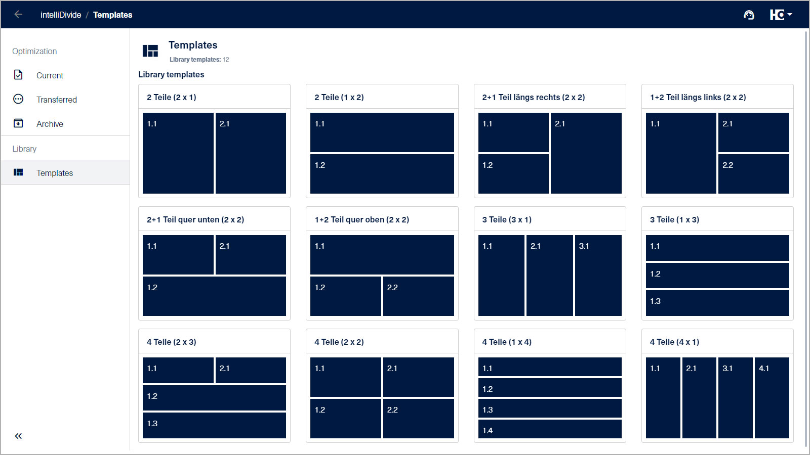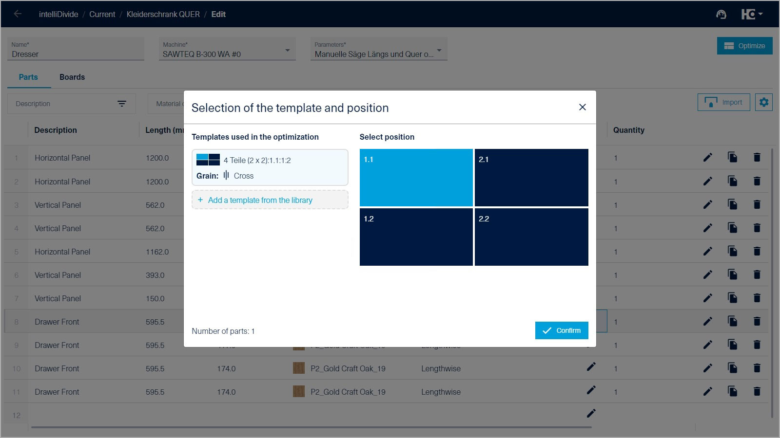 Intelligent optimering med skabeloner: For en bevidst sammenholdelse af komponenter og opskæringen i en angivet placering kan der anvendes skabeloner i intelliDivide. Du har et bibliotek med et stort udvalg af skabeloner til rådighed direkte i appen.