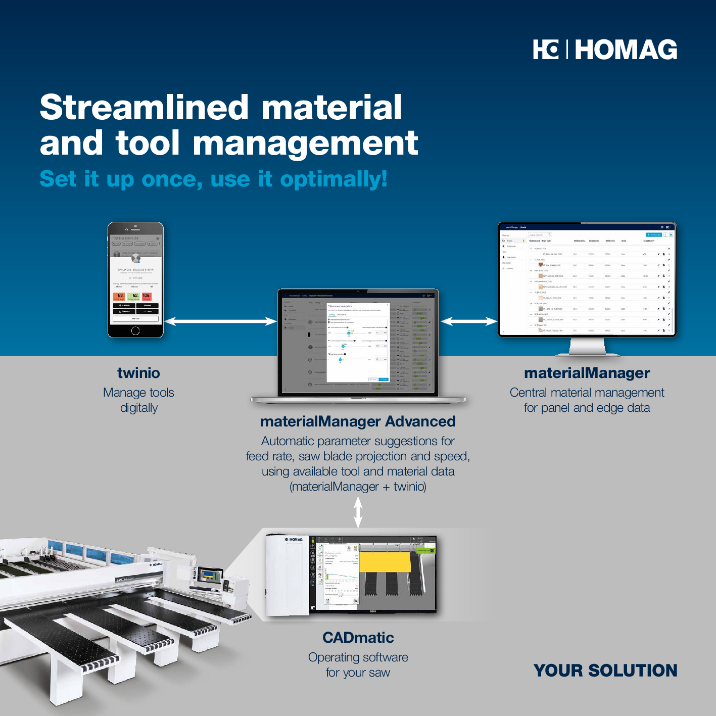 Hvis man har været ansvarlig for opskæringen, så ved man, at en ensartet bearbejdningskvalitet ikke er en selvfølge. Et stort udvalg af materialer, flere maskinoperatører og forskellige save er blot tre af de potentielle daglige udfordringer. Desuden opstår følgende spørgsmål: Hvordan kan værktøjernes levetid forøges? Og hvordan kan arbejdsgangene gøres enkle og effektive? Med materialManager Advanced får du generel support.