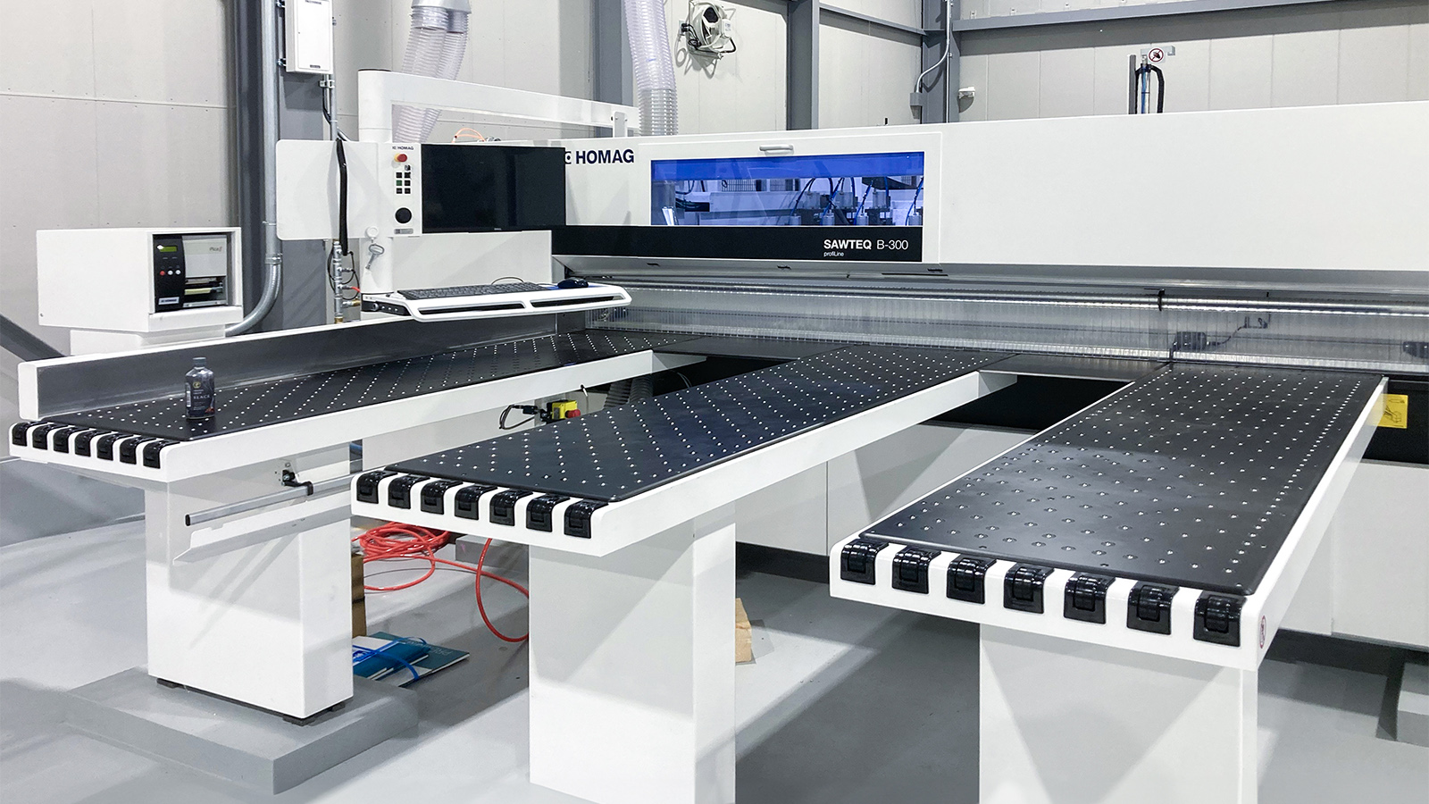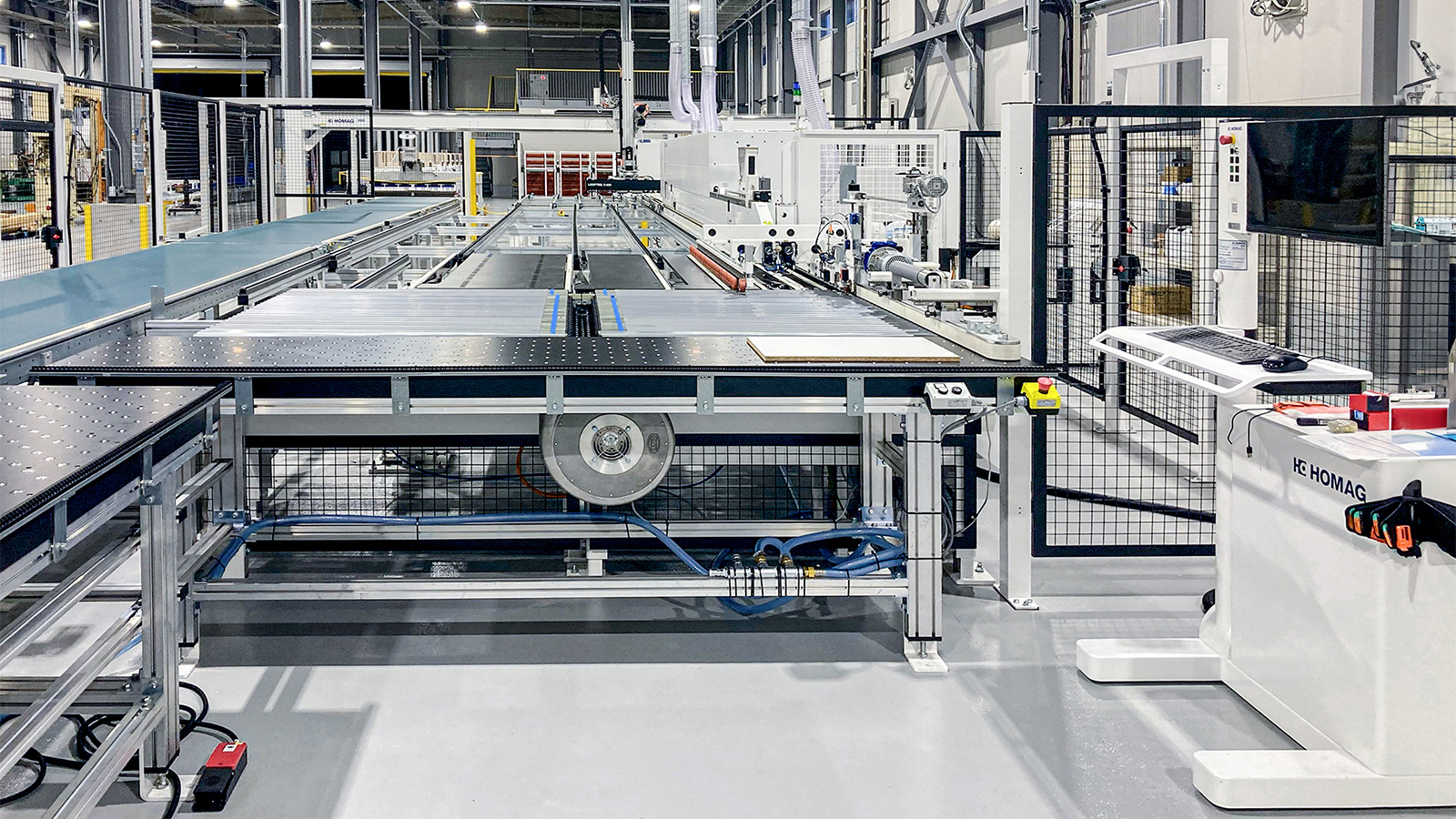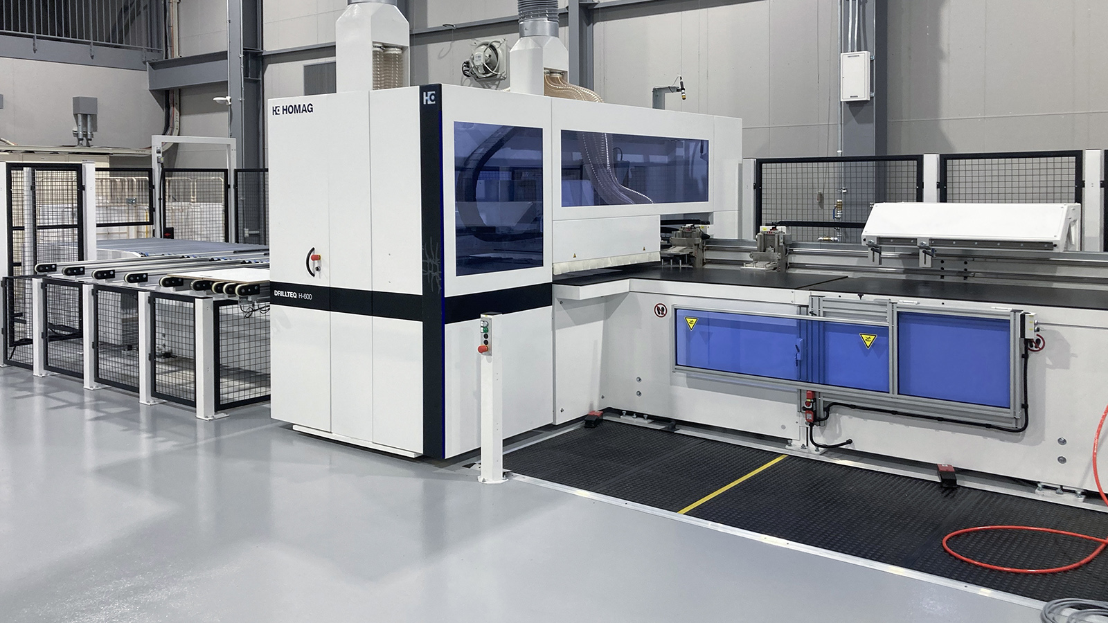 The installation of HOMAG panel diving saw SAWTEQ B-300, edge banding machine EDGETEQ S-500, with return conveyor LOOPTEQ O-600, CNC processing center DRILLTEQ H-600, the manual Sorting system, and a case clamp CABTEQ S-250 underscores a harmonious blend of technology whereby all machines are interlinked vertically via FMS (Factory Management System) and the flexible 3D software HOMAG iX, and horizontally through barcode technology.