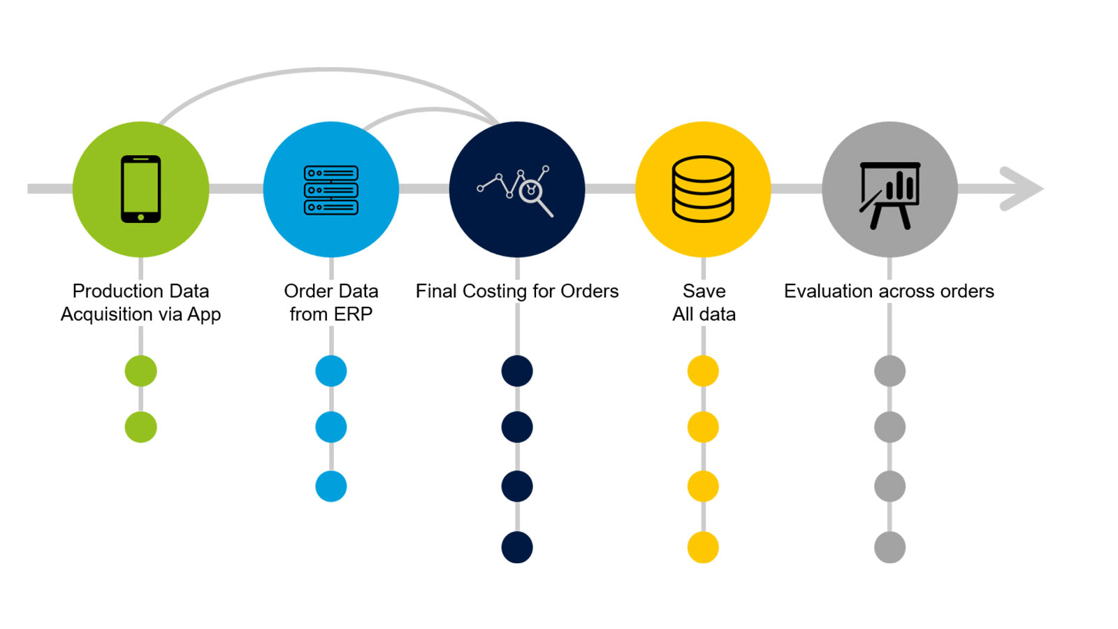 The well-known front manufacturer Reichert Holztechnik GmbH & Co. KG in Pfalzgrafenweiler has been working successfully since this spring with an app developed for him and uses it throughout the entire production process for recording production data. In this application, it was important to implement a meaningful post-calculation promptly. On the one hand, individual orders are evaluated in detail for efficient and inefficient work processes. In addition, a key figure calculation is automatically calculated based on overall order times and materials. To do this, the employees first record times for each operation using the app. This is done flexibly and uncomplicated according to the scheme: "Barcode scan → Start → Stop → Time recorded" via smart phones in production. Further details such as set-up times on the machines or other order information can also be recorded at various workstations. Together with detailed order data from the ERP system, attractive charts can be generated at the click of a mouse. Each order can be evaluated in detail with times, material and corresponding costs. This enables the company to check orders and entire product lines for cost efficiency the first time. The prepared data is then stored in a central repository. This allows the cross-order determination of key figures at the level of each operation. The data calculated in this way are used as standard values in the preliminary calculations of the products.