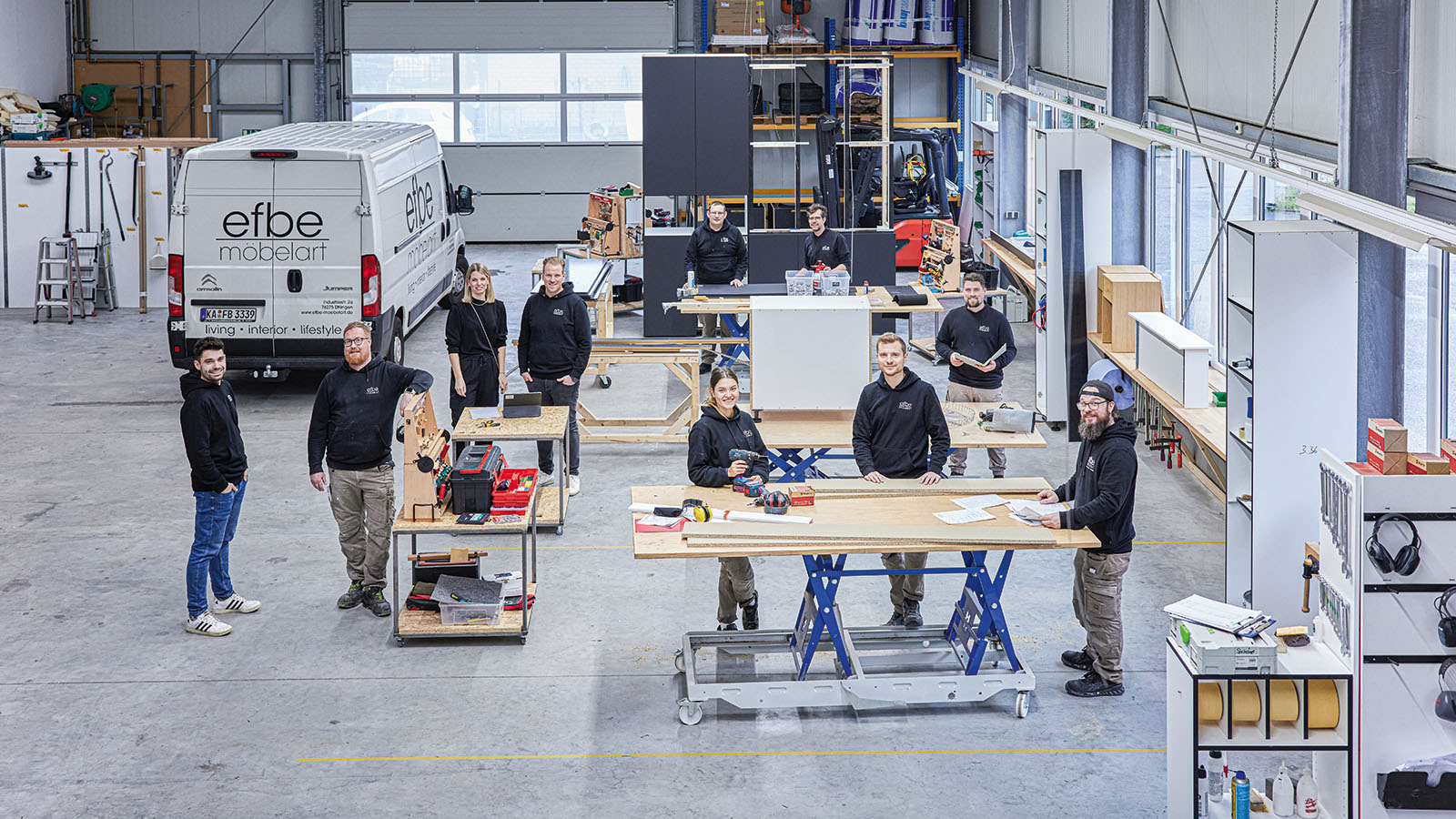 That's why the couple do everything they can to reconcile the different life plans in order to keep knowledge and skills within their own halls. And there are plenty of them in Ettlingen. In addition to Fabian Brust, there are currently four other master craftsmen working in the company - two in work preparation and two as workshop managers. It is not easy to reconcile all these skills - at efbe möbelart they have managed it. Everyone can get involved, express themselves and realize their potential. From the trainee to the foreman. Word gets around and potential applicants see this on the joinery's lively social channels. The result: unfortunately more applications than vacancies. And a pretty satisfied team that delivers outstanding craftsmanship.