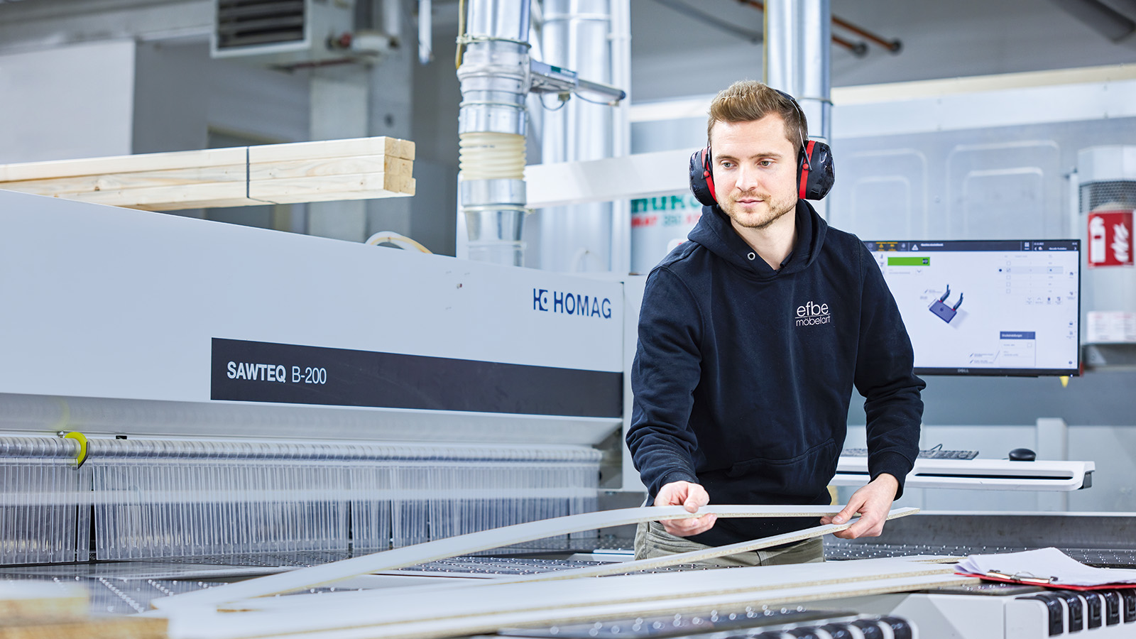 For this reason, a SAWTEQ B-200 panel dividing saw (today: SAWTEQ S-200) has also been in the new production hall since 2021. There was no room for it in the old one. Today, the team designs, plans and manufactures on over 700 square meters - including sampling. Area Sales Manager Patrick Görner was also able to see this for himself. Together, they explored ways in which HOMAG could further support the young company. Initial ideas have emerged, but this should come as no surprise to anyone. After all, not many joineries of this size are as open, courageous and flexible as efbe möbelart.
