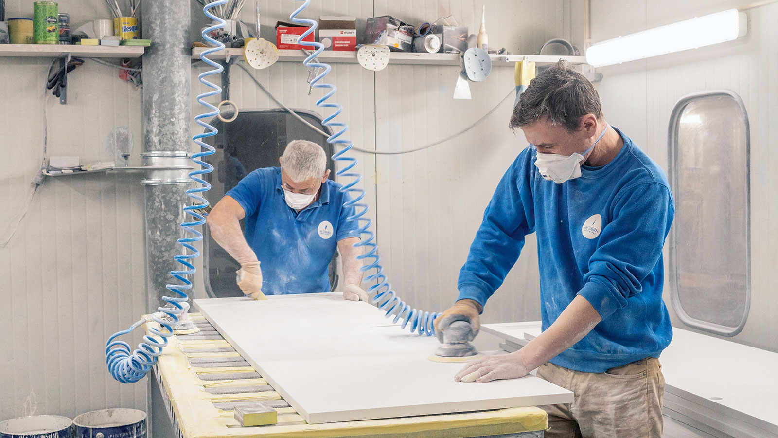 Teixeira builds parts for shelves, cabinets, kitchens or doors on the production line. Sometimes, these parts are sold separately. At other times, they are parts for a large project. After all, Teixeira furnishes entire buildings for his customers. His people build windows and doors for hotels, panel walls in office buildings or construct seating for concert halls and conference rooms. Always madeto-measure and according to the customer’s requirements. Around 150 out of a total of 350 employees work in the field.