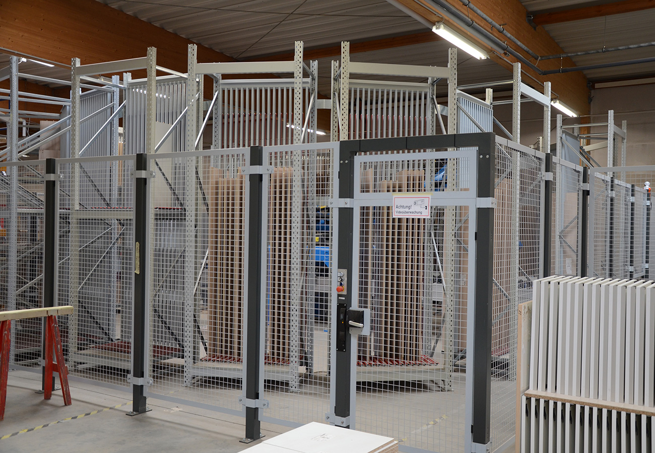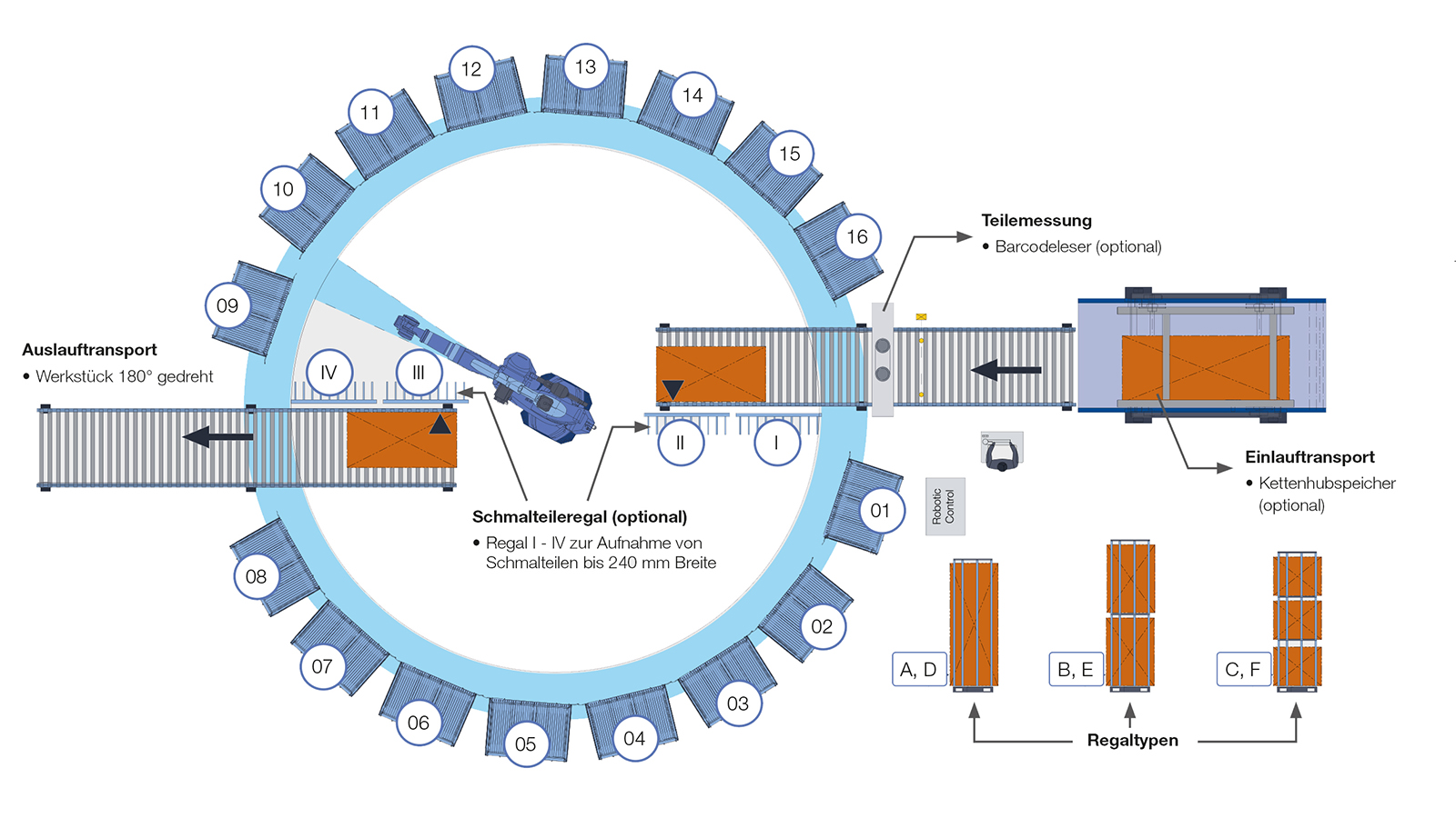 Since at STARKE only one roller conveyor runs through the circle shaped shelf system, it is possible to arrange each eight shelf elements on the left and right side providing place for a total of 500 parts. Three different types can be selected for each element - one, two or three stories with two different material thicknesses (16 to 19 mm and 19 to 26 mm), which are determined customer-specific due to his part mix.