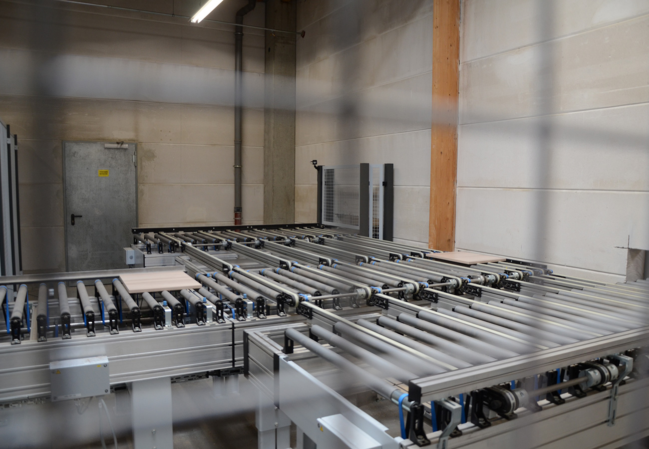 Exactly that is what the robot cell offers. Here, all furniture parts are temporarily stored, which have been provided with and edge and equipped with all necessary drillings directly in front of the sorting cell. The furniture parts will arrive at the center of the circle shaped shelf system over a driven roller conveyor. Here, it is decided which way the part will take.