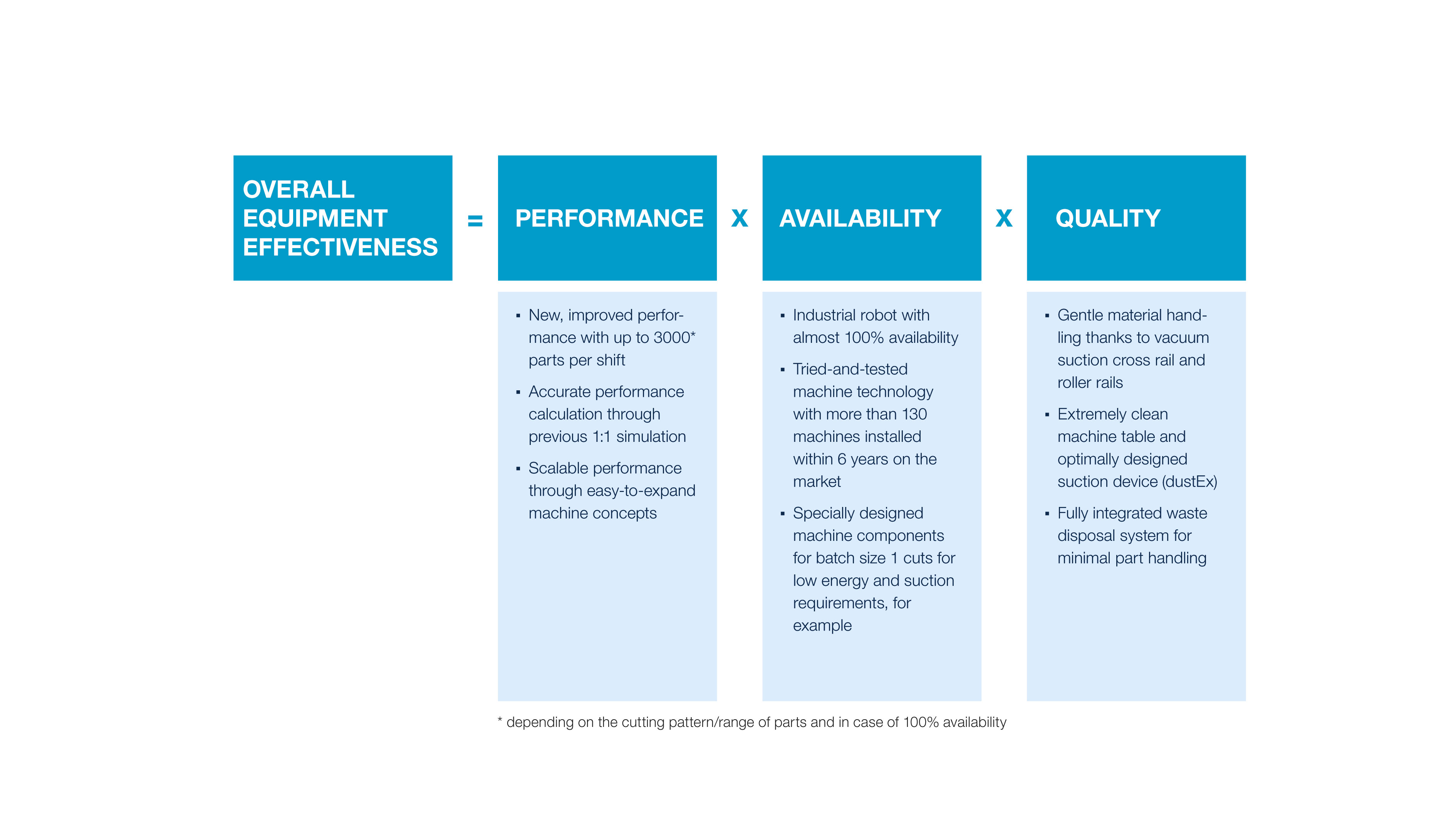 Thanks to its new, improved performance, the SAWTEQ B-320 flexTec has a markedly positive impact on your processes. The result can be seen in the holistic and fully integrated machine concept that improves all three aspects (performance, availability and quality) of the overall equipment effectiveness (OEE).