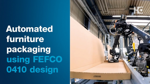 The line reproduces the complete process of automated furniture packaging from folding of the cardboard box in FEFCO 0410 design, insertion of the workpieces and filling material to automatic closing, gluing and stacking of the boxes.