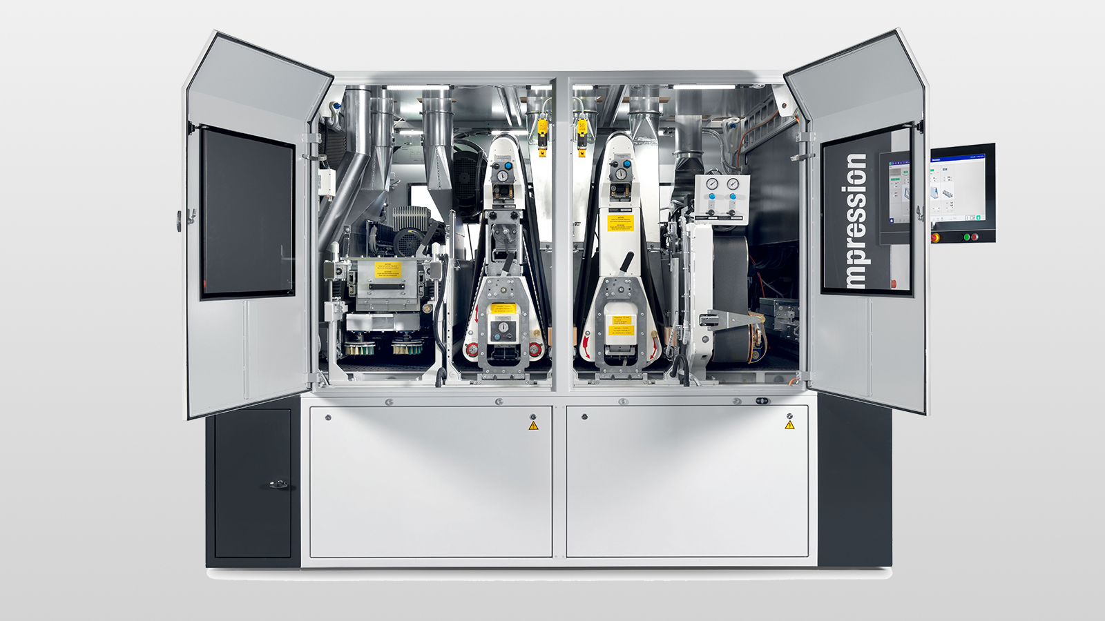 The IMPRESSION Series chassis can house 2 – 5 full size working units. Standard belt size for wide belt heads 54” x 103”. Available working heads: “M” Planer, “R” Drum, “Q” Cross Belt, “C” Wide Belt with segment & roller, “H” Wide Belt with Chevron belt, “D” DBS system, “B” brushing units, Special Effects software.