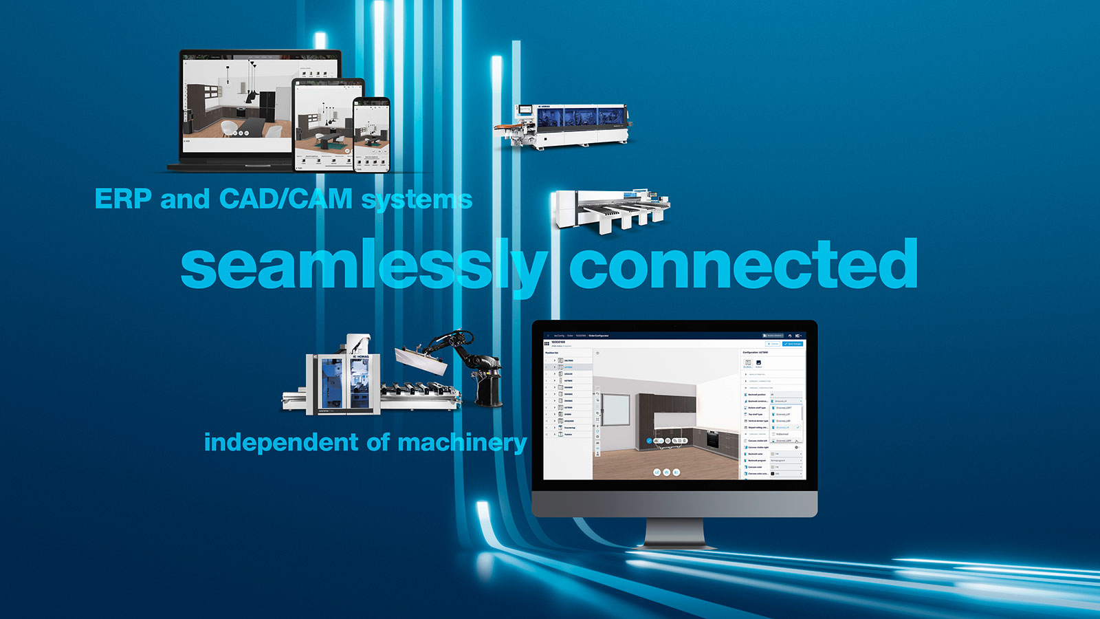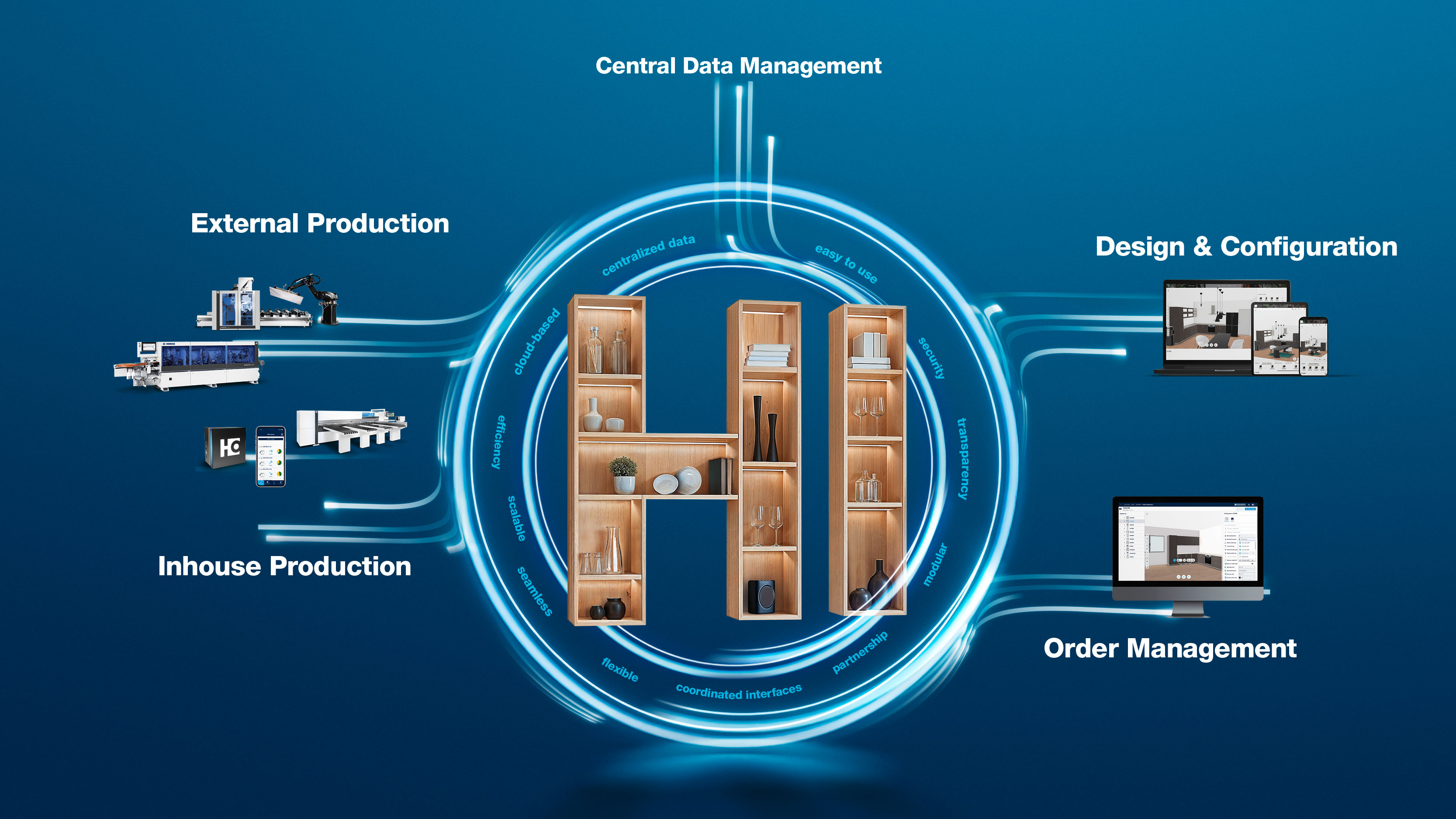 With HOMAG INTELLIGENCE, HOMAG does not offer a single software, but an open platform that seamlessly connects all data generated in furniture sales and production – regardless of the machinery, existing software landscape or company size.