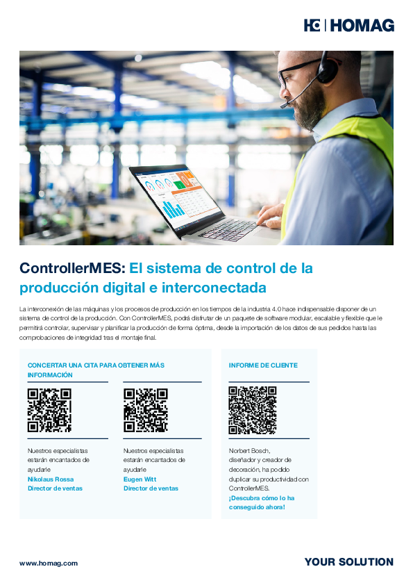 ControllerMES garantiza unos flujos de información interconectados de forma inteligente, tanto dentro de la producción como en el registro de pedidos (su sistema de ERP, por ejemplo). ControllerMES adapta los datos procedentes del sistema previo a su sistema de producción y los completa mediante reglas. Para ello, hay disponibles interfaces para todos los sistemas CAD/CAM habituales, como HOMAG iX, que pueden personalizarse en función de las necesidades de los clientes. También es posible conectar sistemas de registro de horarios de trabajo o de datos de la maquinaria para disponer de toda la información necesaria en un solo sistema. -
