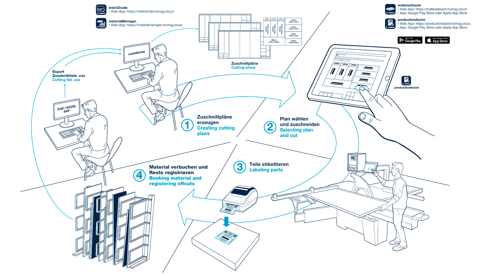 El volumen de suministro contiene los siguientes componentes:- Cuatro aplicaciones: intelliDivide Cutting (software de optimización de corte), productionAssist Cutting (asistente digital en producción para corte manual), materialManager (gestión central de materiales) y materialAssist Boards (gestión de placas y restos en el lugar de trabajo en producción)