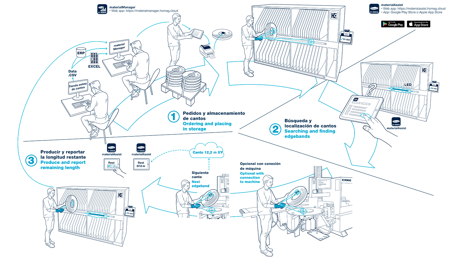 - Lo primero es preparar el trabajo. En primer lugar, introduzca el material y los datos de los cantos en la aplicación web materialManager o impórtelos directamente. En materialManager, puede gestionar todos los materiales de forma centralizada para su empresa. La aplicación le muestra siempre las existencias actuales y dónde se encuentra cada rollo. Durante la producción, puede almacenar los rollos de cantos en la estantería de cantos e introducir los datos correspondientes en la aplicación materialAssist en la tableta. Así, desde ese momento podrá acceder fácilmente a toda la información sobre cada rollo de cantos (como las propiedades o la longitud restante). También puede imprimir directamente las etiquetas correspondientes de forma muy sencilla (con el ID, el código de canto y las dimensiones de la cinta de cantos) para identificar las cintas de cantos.