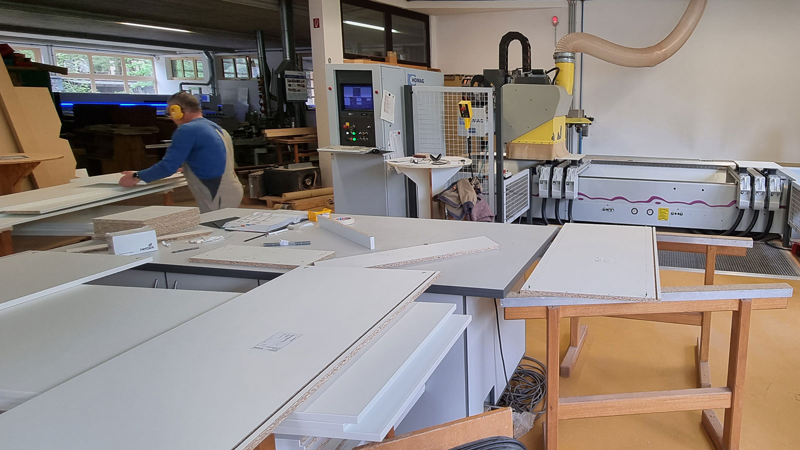 El taller de carpintería confía en las máquinas de HOMAG para conseguir una producción constante desde el corte hasta el rectificado, pasando por el encolado de cantos y el mecanizado CNC. Su manejo es similar, por lo que también facilitan el trabajo diario. Además de con la calidad de mecanizado, los Schwieck también están encantados con el servicio cercano que reciben: "Nos llevamos bien y tenemos una buena relación; para nosotros, ahí radica la diferencia".