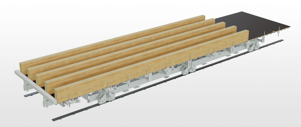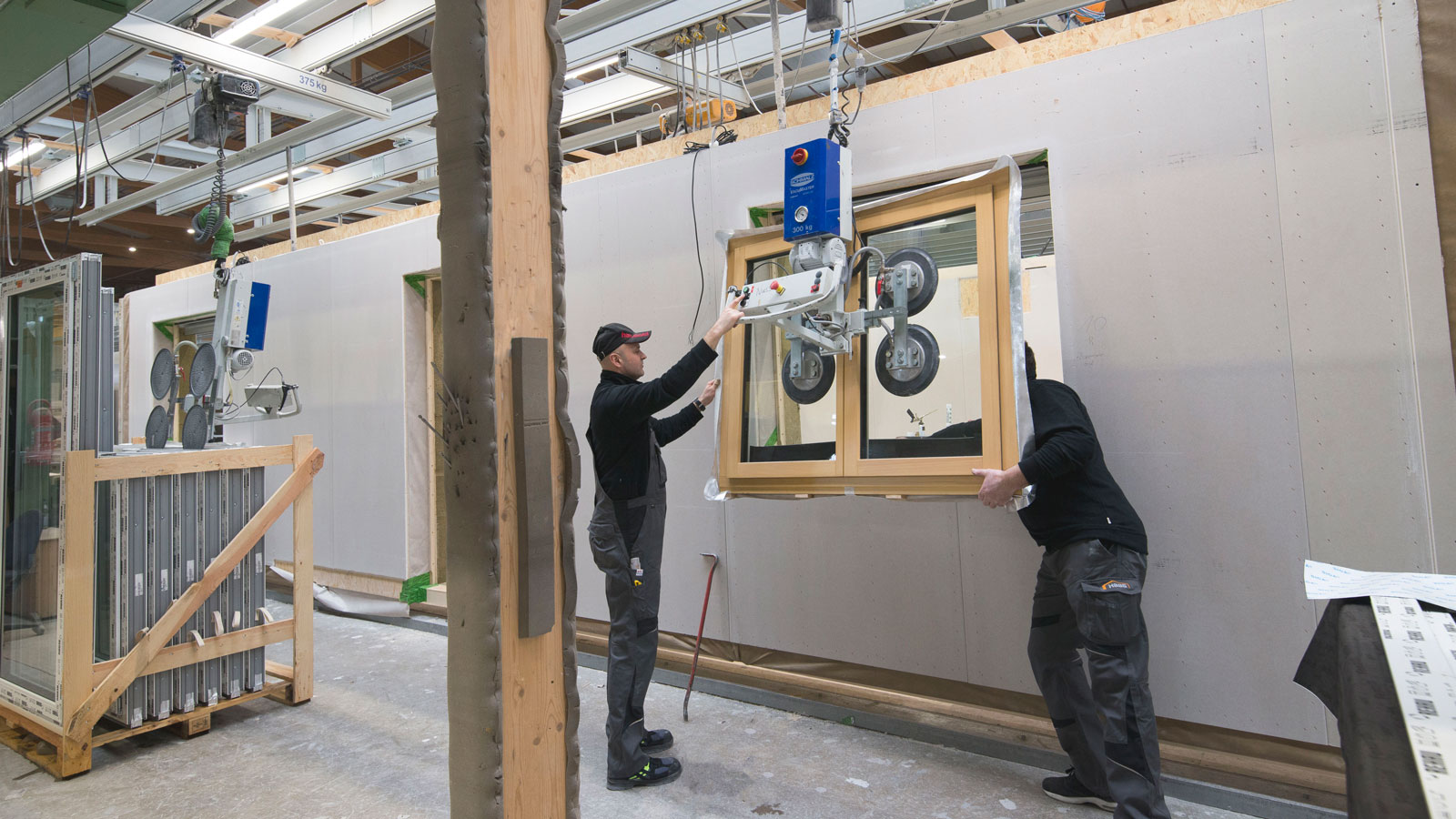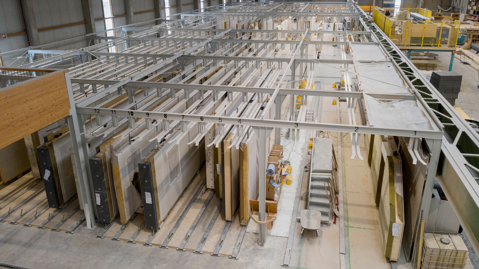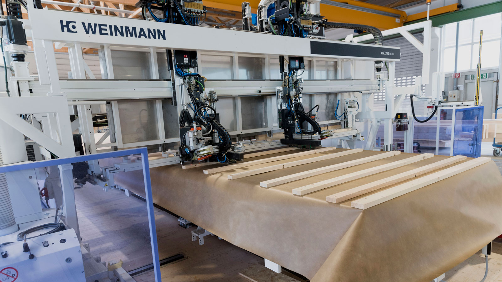 La gran versatilidad y la gran cantidad de piezas supone un uso intensivo de conjuntos de máquinas; en Alemania, la línea de producción de elementos de pared se compone de tres hileras de mesas: en la primera, a una estación de armazón WEINMANN FRAMETEQ F-700 le sigue un puente multifunción WALLTEQ M-380 con dos mesas y transmisor para el proceso de volteo; en la segunda, además del dispositivo de arrastre, hay otras tres mesas y un segundo WALLTEQ M-380. En ambas filas hay amortiguadores con topes para trabajos laboriosos. Los tableros se colocan mediante un elevador, el aislamiento se coloca manualmente para poder satisfacer una gran variedad de deseos de los clientes. Los dos puentes multifunción permiten aumentar sin problemas el rendimiento en horas punta, por ejemplo, en la fabricación de un edificio residencial más grande, y se evitan los cuellos de botella. La tercera fila de mesas sirve para el mismo fin: allí se dividen operaciones como el montaje del aislamiento exterior. También en este caso se trabaja manualmente, a lo que se añade una gran variedad en los sistemas de fachadas. Los elementos terminados llegan a una plataforma elevadora de camiones con mesa de montaje, que los transportan cuatro metros hacia abajo, a una parte inferior de la nave, y los almacenan en dos almacenes de pared con una capacidad de 3000 m2. El "efecto de presentación" para los clientes gracias a una plataforma de observación producida por la diferencia de altura de la pendiente del almacén. También en los almacenes de montantes, la empresa se centró en la flexibilidad: en total, tres carros distribuidores permiten la entrada, el movimiento y la salida flexibles, de modo que un edificio grande, cuya tramitación se retrasó, no supuso un cuello de botella para otros proyectos. En el almacén también se realiza el acabado con la limpieza y montaje de ventanas. Por razones de espacio, en Austria se ha optado por una solución algo más pequeña con una "mesa de expulsión" para las paredes interiores más rápidas, mientras que en la fabricación de elementos del techo y tejado en Falkenberg se ha podido aprovechar al máximo tras una remodelación de la nave. El WALLTEQ M-380 que se utiliza aquí se desplaza sobre tres mesas, está equipado con un grupo para colocar y fijar listones de techo y también puede colocar encofrados en caso necesario. También en este caso existe una serie paralela de mesas como almacenamiento intermedio para operaciones complejas, por ejemplo, para el aislamiento y, más tarde, para la instalación; en este momento no supone un problema, pero "nunca se sabe a dónde va el viaje". La anchura del elemento es de hasta 2,50 m, la longitud estándar es de 14 m y puede aumentarse a 18 m mediante soportes. "14 m me permiten dos elementos por mesa y, por lo tanto, aumentar el ritmo", explica Xaver A. Haas. "Además, el empleado de la mesa puede fabricar dos lados del techo opuestos y reflejados a la vez para esa longitud, lo que simplifica el proceso. Cuando trabajamos en la construcción de objetos necesitamos 18 m con un sistema de tres campos".