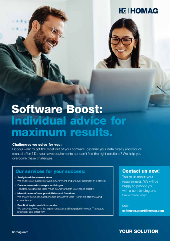 ¿Ya trabaja con software HOMAG? Entonces aproveche todas las posibilidades que su solución ofrece. Nuestros expertos analizan su entorno actual, identifican oportunidades de optimización y le muestran funciones que quizá aún no haya descubierto. Juntos desarrollamos conceptos personalizados y acompañamos la implementación, de manera práctica y fiable.