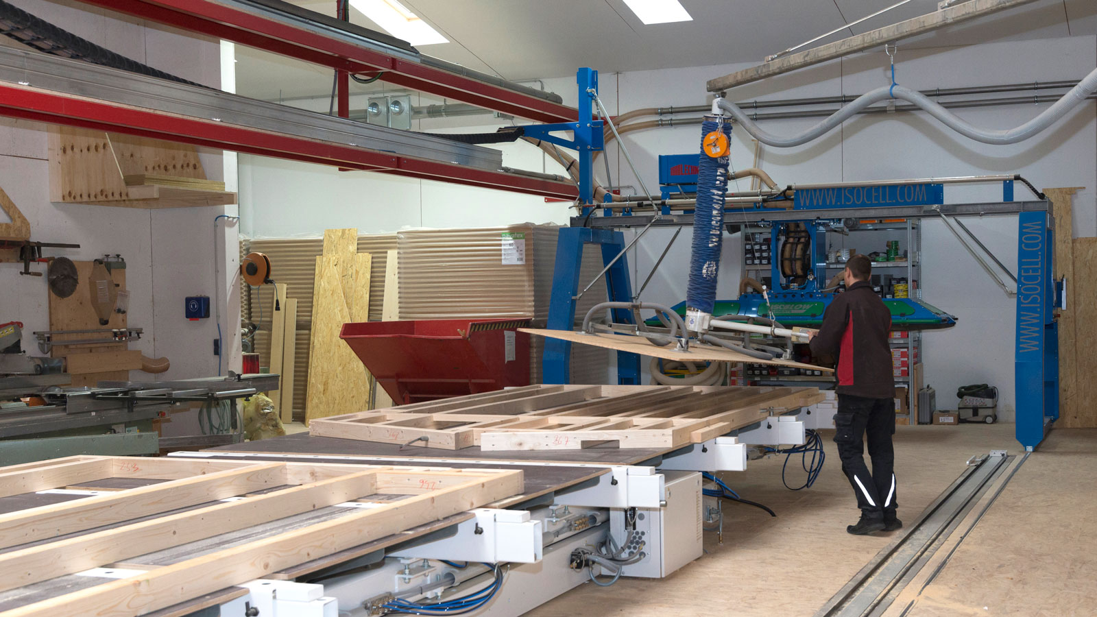 Malgré tous les avantages, l'automatisation n'aurait probablement pas été possible à Buchbach si le WALLTEQ M-120 n'avait pas été lancé sur le marché sous sa forme actuelle : « C'était la solution idéale pour notre situation, car elle était faite sur mesure pour s'adapter à notre budget et à notre salle ». Cette dernière s'est notamment révélée être un obstacle à la modernisation compte tenu de l'espace limité disponible. Seule la suggestion d'un consultant de WEINMANN a apporté une solution satisfaisante pour les charpentiers : « Il nous a conseillé d'utiliser un pont de maître charpentier avec une table de montage compacte », explique Johann Lechner. « Cela nous évitait d'investir dans un nouveau hall. Une chaîne de production plus importante aurait été surdimensionnée pour nous à tous égards en termes d'espace requis et de performances ». Actuellement, les éléments de toit et de plafond de Buchbach sont en grande partie fabriqués à la main. Le pont de maître charpentier sert à fabriquer principalement des éléments de cloison. Revêtus de façon unilatérale, ils sont d'abord usinés par la WALLTEQ M-120 puis tournés à l'aide d'un pont roulant. Pour cela, la table de montage dispose d'une fonction de levage qui permet de monter l'élément en douceur et en toute sécurité. Cela évite l'endommagement des éléments lors de la dépose ou en cas de revêtement dépassant. Après la rotation, le soufflage de l'isolation en fibres de bois est réalisé à l'aide d'un panneau d'insufflation manuel d'Isocell déjà existant et qui peut être combiné aisément avec la nouvelle ligne de production. Après la fixation et le fraisage du deuxième revêtement par le pont de maître charpentier, les éléments sont verticalisés à l'aide de la table de montage et passent à la finition, où les fenêtres sont installées et les façades sont préfabriquées. C'est le goulot d'étranglement de la production : si la station de finition est occupée, le pont de maître charpentier ne peut plus continuer à produire. Avec le nombre actuel de pièces, cela ne pose pas de problème.