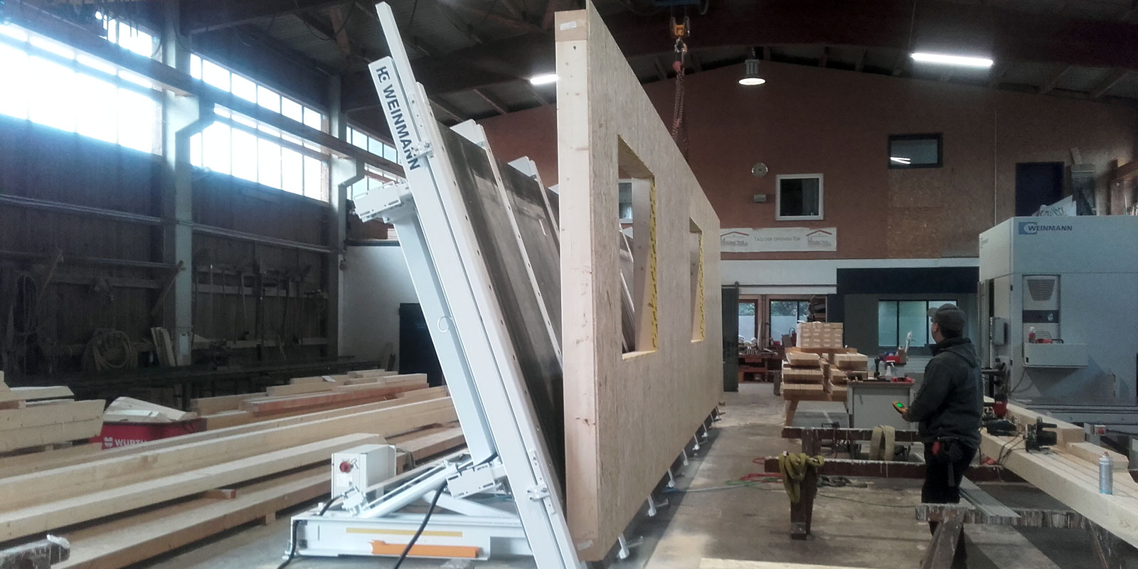 Le positionnement des éléments à un angle de 90° était très complexe en raison de la conception souple de la table, notamment pour les bois tordus. En outre, le serrage était très long dans la mesure où le processus de serrage n'était réalisable qu'avec des équipements auxiliaires complexes, par exemple des pinces de serrage. Un autre point a sans cesse posé problème à Holzbau Vock : la pose ou le retournement des éléments à l'aide du pont roulant. Pour les éléments avec des dépassements de panneaux notamment, le risque d'endommagement est élevé et les accidents sont fréquents lors de la pose avec le pont roulant dans la mesure où l'élément glisse. Stefan Vock, chef junior chez Holzbau Vock, a donc cherché un système adapté en vue d'optimiser le processus de travail. Avec la table de charpentier BUILDTEQ A-530 de WEINMANN, il a trouvé la solution idéale. « La table massive en acier garantit la précision angulaire, permet le serrage pneumatique et garantit le montage sécurisé des éléments. C'est précisément ce qui nous a manqué jusqu'à présent », affirme Stefan Vock.