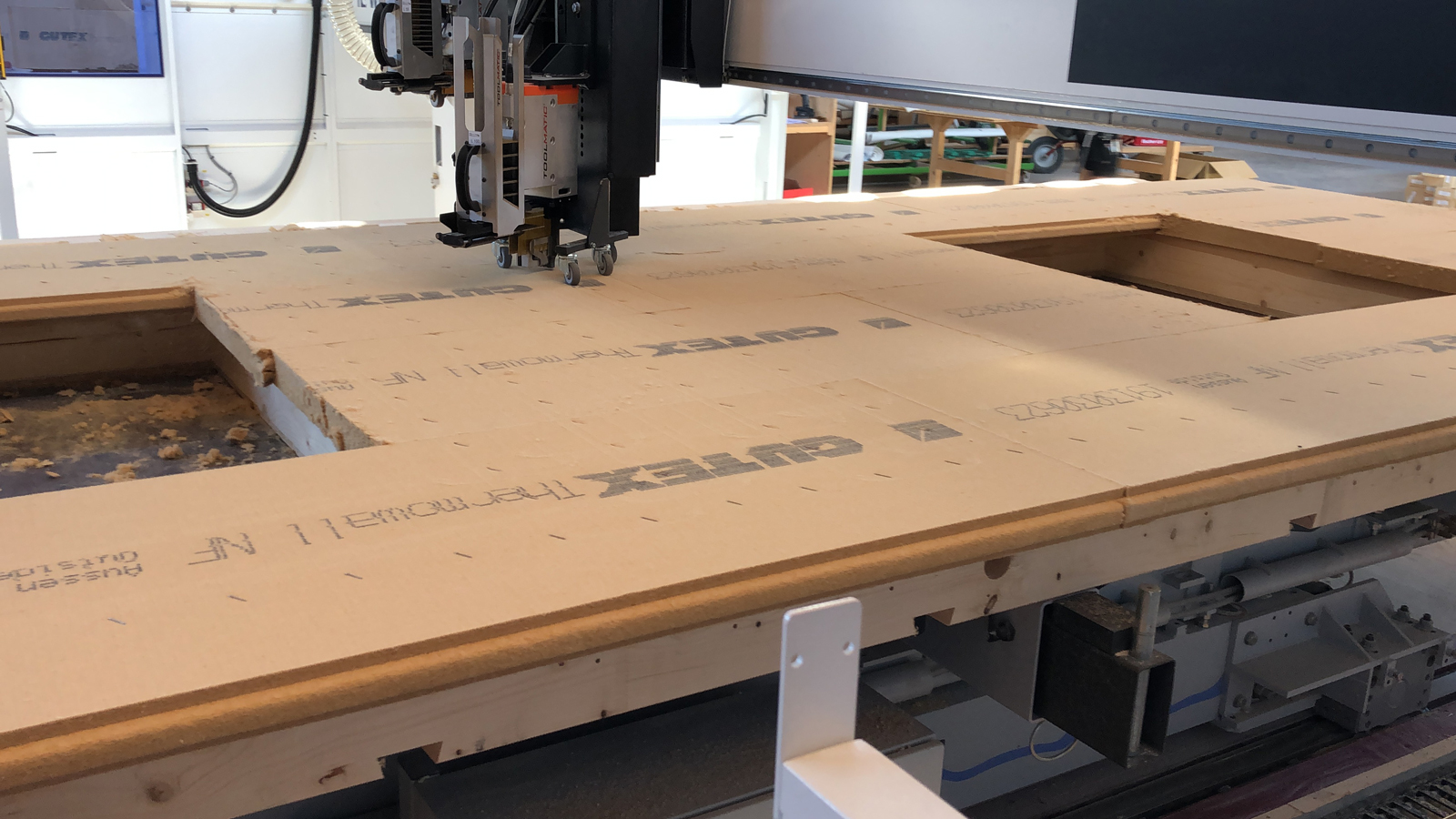 Tous les bâtiments de Hänsler sont personnalisés. Les hauteurs de cloison sont par exemple construites selon le souhait du client. D'après Wilfried Hänsler « l'usinage des éléments individuels fonctionne parfaitement avec la machine ». La structure de cloison est composée à l'extérieur d'une plaque de support de crépi de 60 mm et d'une isolation extérieure avec une isolation en fibres de bois, et à l'intérieur, par défaut, d'un panneau de bois massif à coffrage diagonal GFM. Le coffrage est composé d'un panneau de 30 mm en sapin blanc de la Forêt Noire et ne contient pas de colle ni de produits toxiques. Avec ses 30 mm, il est plus épais que les panneaux OSB et garantit une meilleure insonorisation. En outre, grâce à l'absence de produits toxiques, il renforce le climat de bien-être à l'intérieur de la maison. Une plaque de gypse renforcée par fibres de cellulose de 15 mm (ou un panneau en argile sur demande) est installée à l'intérieur de l'espace d'installation, également isolé avec des fibres de bois.