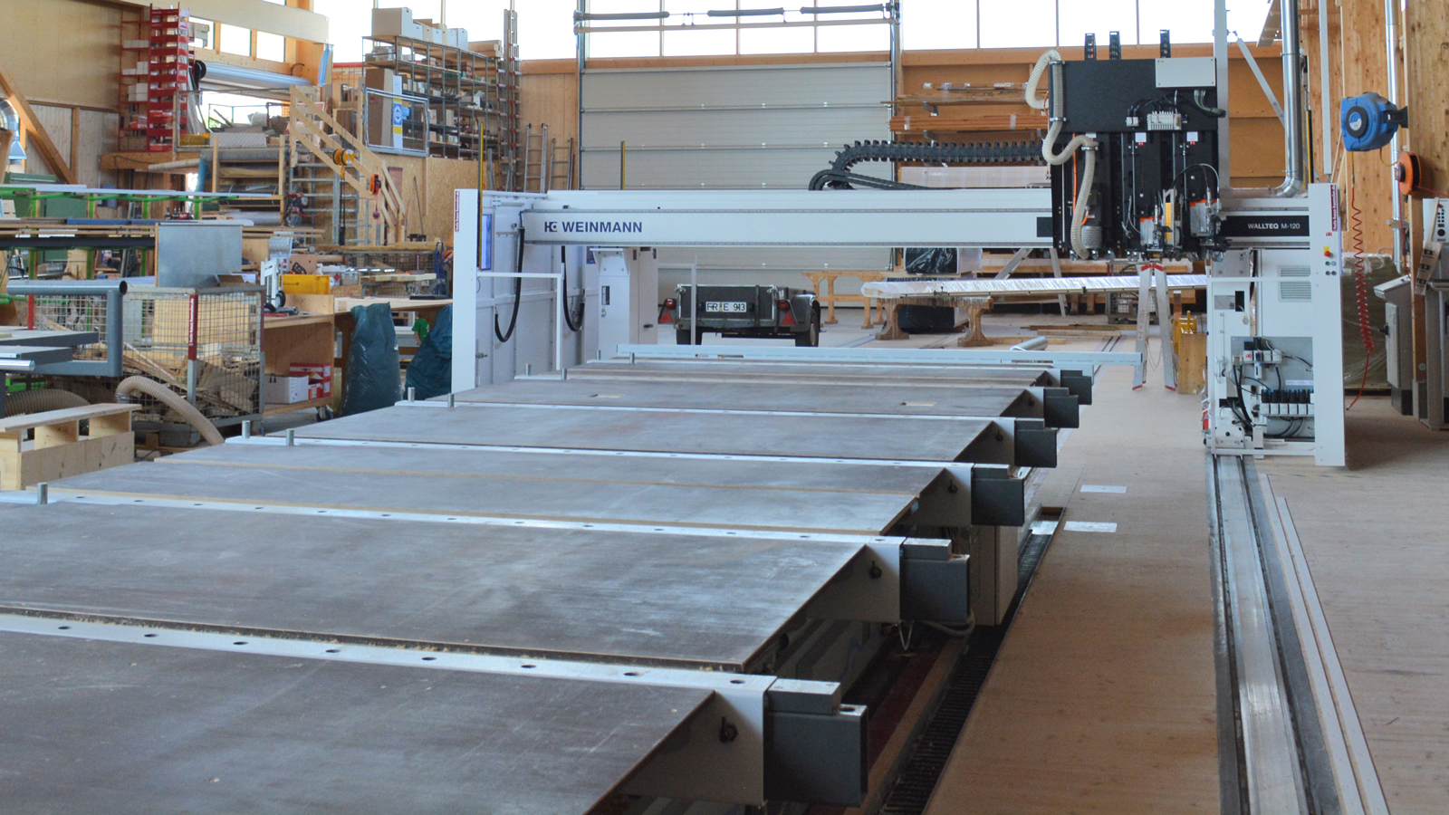 Les clients de Hänsler se trouvent dans un rayon proche de 15 à 20 km, et l'entreprise souhaite conserver cette proximité régionale. Hänsler produit entre 9 et 12 maisons par an, dont des bâtiments commerciaux. La construction de maisons et de commerces occupe la plus grande partie de l'activité, à côté notamment de la fabrication d'éléments en sous-traitance. Sur ce secteur, Hänsler termine actuellement un projet qui comprend la fabrication d'environ 400 m² d'éléments. Wilfried Hänsler est ravi de la vitesse de production. « Pour notre projet actuel, nous avons déjà fabriqué quatre cloisons avec plusieurs niveaux de panneaux en l'espace de trois heures. Cela n'aurait pas été possible manuellement. » Les petits projets, comme par exemple les carports, sont désormais rapidement produits avec le pont multifonctions : « nous avons placé les éléments, et la machine a réalisé tout l'usinage. » En outre, le WALLTEQ a entre-temps été utilisé pour d'autres travaux, comme par exemple le fraisage d'entrées de tiroir. Ce type d'usinage se fait en parallèle.