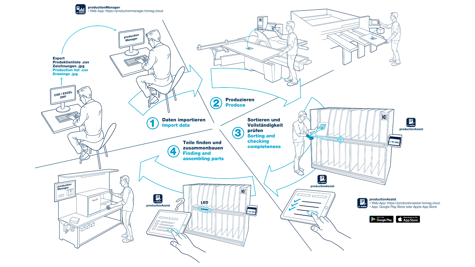 Gain de temps et processus sûrs : aucun temps d‘attente dû à des pièces manquantes, toutes les pièces à monter sont complètes. productionManager , le dossier de commande numérique qui fournit également toutes les informations (y compris les dessins).