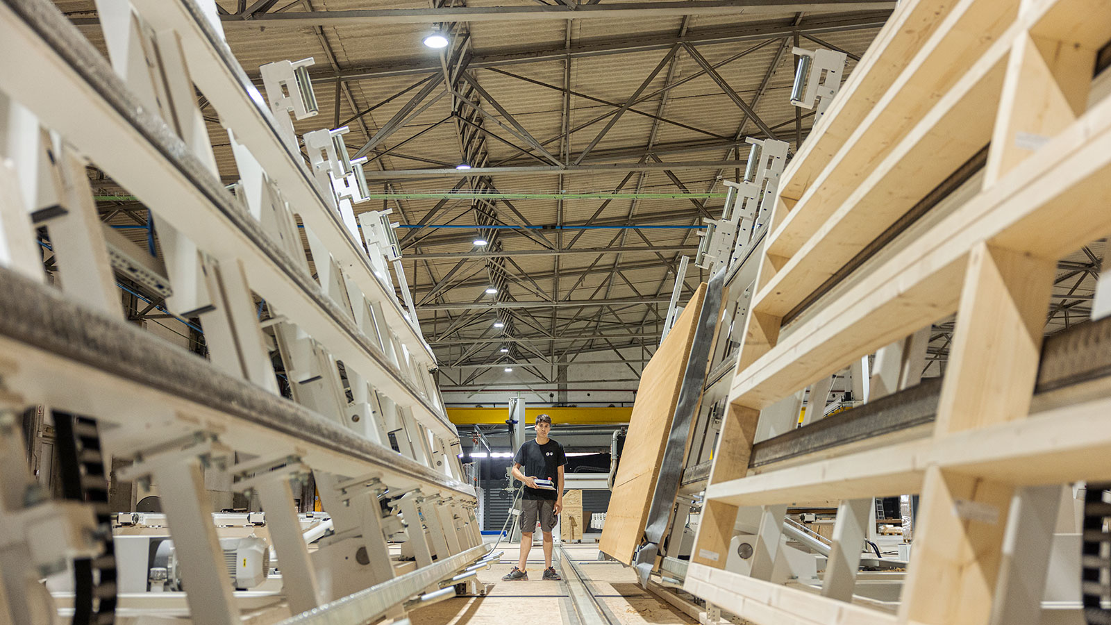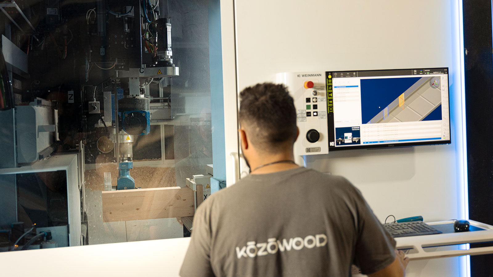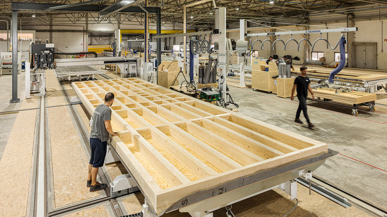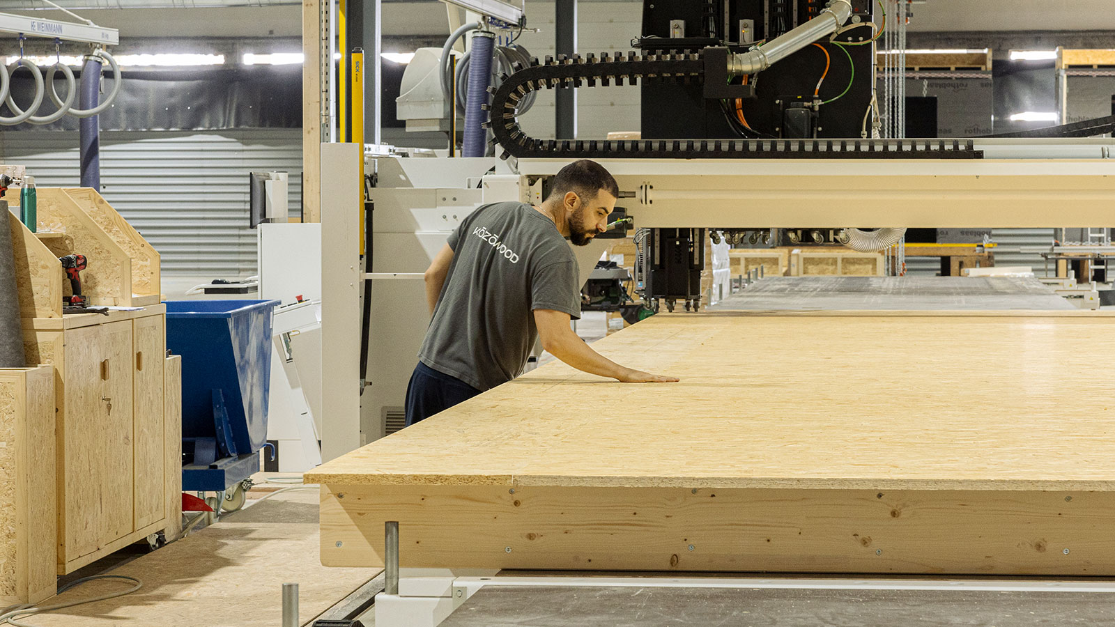 Per incrementare la produzione, Kōzōwood ha investito nello sviluppo di due aree principali: realizzazione di elementi d'intelaiatura e legno lamellare. Così ha creato una base sostenibile per la sua crescita futura. Fin dagli esordi, l'azienda si è basata su una linea di produzione WEINMANN per la prefabbricazione degli elementi in legno. Messa in funzione a fine 2022, la linea consente oggi di produrre da 250 a 300 case l'anno. Per ampliare la produzione, l'azienda si è dotata inoltre di una linea per il legno lamellare dei produttori System TM e Kallesoe, facenti parte anch'essi di HOMAG Group. Le linee di produzione utilizzate da Kōzōwood permettono all'azienda di raggiungere un livello di efficienza, qualità e centralità del cliente indubbiamente emblematico nell'Europa meridionale. Per ridurre l'impatto negativo della carenza di manodopera qualificata, l'azienda investe anche in corsi interni di formazione e in consulenze internazionali che coinvolgono i dipendenti della produzione e dell'assemblaggio. Attualmente Kōzōwood conta circa 100 dipendenti e prevede di aumentarli presto di ulteriori 150 unità. L'azienda punta a produrre tre case al giorno entro il 2025, un traguardo che le consentirebbe di distinguersi sia sul mercato nazionale che su quello internazionale. Tuttavia, per raggiungere l'ambizioso obiettivo sono fondamentali anche gli investimenti nella tecnologia giusta: la produzione di elementi con le macchine WEINMANN incomincia con il taglio e la sezionatura delle travi mediante l'apposito impianto BEAMTEQ. Le travi sezionate vengono quindi trasportate alla linea della parete o alla linea del tetto e soffitto. Nella fase successiva, le travi per la realizzazione delle pareti vengono applicate e connesse in modo preciso sui tavoli di montaggio BUILDTEQ. Con l'aiuto di sollevatori a depressione, i materiali di rivestimento vengono quindi posati ergonomicamente sulle costruzioni a traverse e successivamente fissati con un ponte multifunzione WALLTEQ. Dopodiché, gli elementi vengono capovolti automaticamente per avviare il processo di insufflazione dei materiali isolanti, quali cellulosa o fibra di legno. L'intero processo è controllato dal CNC WALLTEQ M-300. Alla fine anche gli elementi isolati vengono rivestiti e fissati. Il successivo trasporto in un magazzino a parete consente di eseguire ulteriori lavori come l'installazione di finestre o la lavorazione di facciate. Fedele al motto di Kōzōwood, la realizzazione di elementi chiusi e insonorizzati favorisce la sostenibilità e l'ecologia della costruzione in legno e soddisfa allo stesso tempo gli elevati requisiti di isolamento termico e acustico a lungo termine. Le tecnologie delle linee di produzione permettono a Kōzōwood di costruire case su misura in modo rapido ed efficiente, raggiungendo livelli eccezionali di produttività ed ergonomia dei dipendenti. Inoltre, la prefabbricazione degli elementi in fabbrica e il tempo impiegato in cantiere vengono drasticamente ridotti.