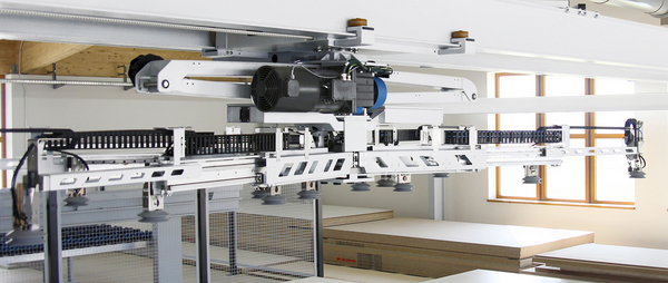 中心的な機械は、HOMAG Automation のパネル倉庫 TFL 411 と HOLZMA の 鋸 HPP 300 から構成されたカットセル、HOMAG Automation の部材リターンシステム TFU 220 を伴う HOMAG の縁貼り機 KAR 350 を装備したエッジ加工セルです。ボール紙裁断機 VKS 200 も同様に HOMAG Automation から納入されています。