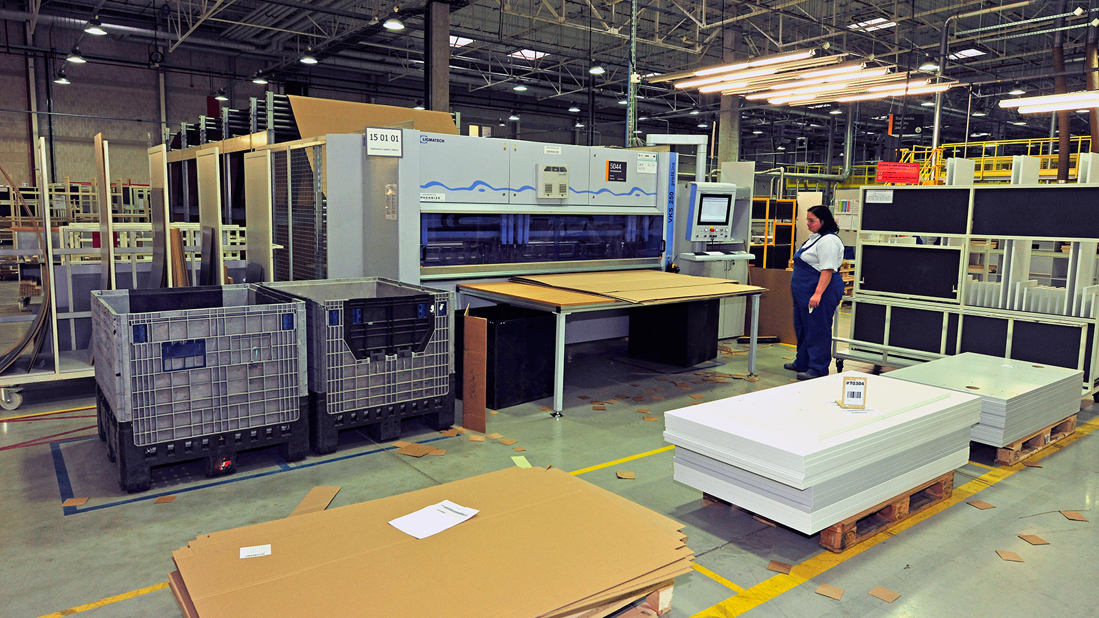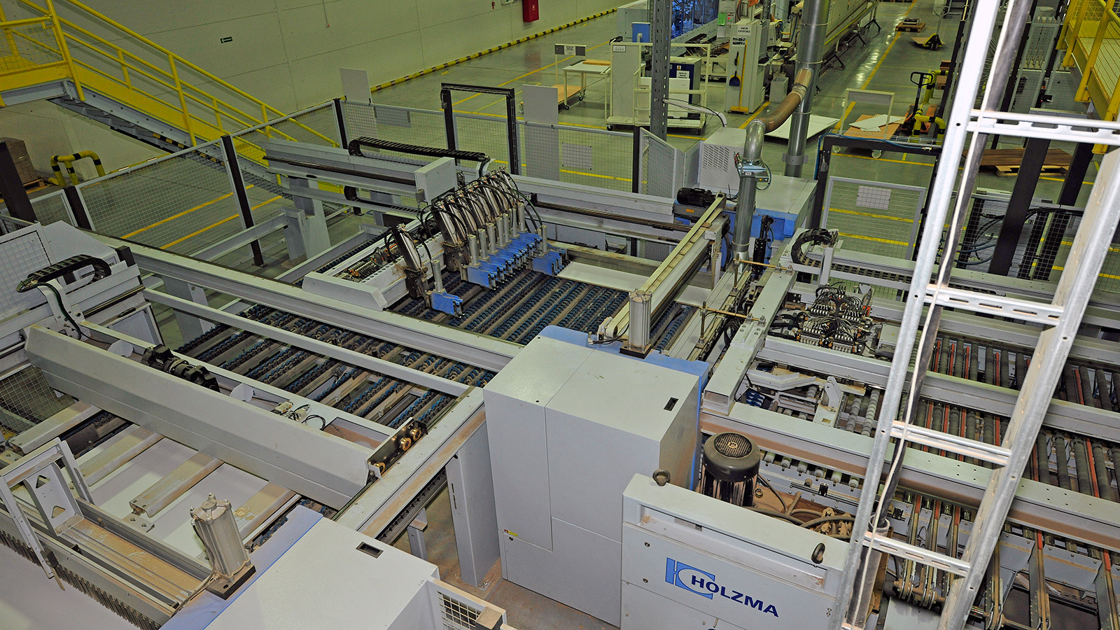 Den ersten Abschnitt der Anlage in Jaslo bildet ein Lager, in dem 2 800 x 2 070 mm große Platten mit unterschiedlichen Dekoren liegen. Über den Stapeln flitzen zwei Kranbrücken hin und her, über deren Saugportale je Schicht 400 Platten zum Zuschneiden entnommen und weitere 400 Platten für die nächste Schicht vorbereitet werden. Die Lageranlage ist vernetzt und kennt die Produktionsdaten. Sie weiß daher, welche Platten in welcher Farbe oben liegen müssen, um sie im richtigen Moment in die Fertigung einzusteuern. Vorab berechnet ein Programm das optimale Schnittbild. Den Zuschnitt mehrerer übereinanderliegender Platten erledigt eine moderne Plattenaufteilsäge von HOLZMA.