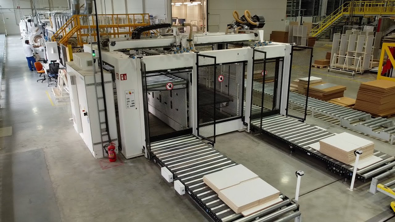 The line reproduces the complete process of automated furniture packaging from folding of the cardboard box in FEFCO 0410 design, insertion of the workpieces and filling material to automatic closing, gluing and stacking of the boxes.