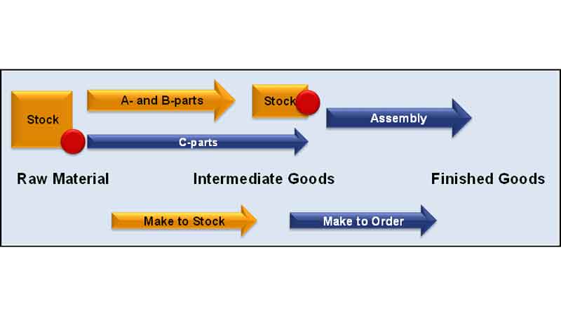 Fertigungsprinzip: Passt eine auftragsbezogene Fertigung in „Losgröße 1“ zur Auftragsstruktur? Oder ist es sinnvoll Teile auf Zwischenlager zu produzieren? Welche Änderungen sollten eingeleitet werden?