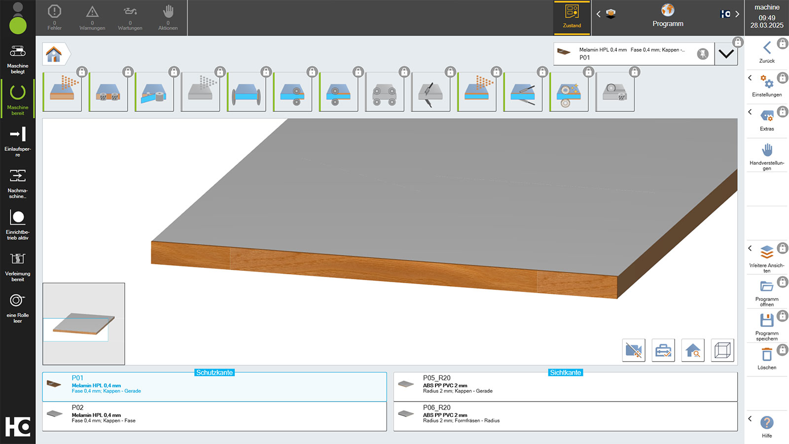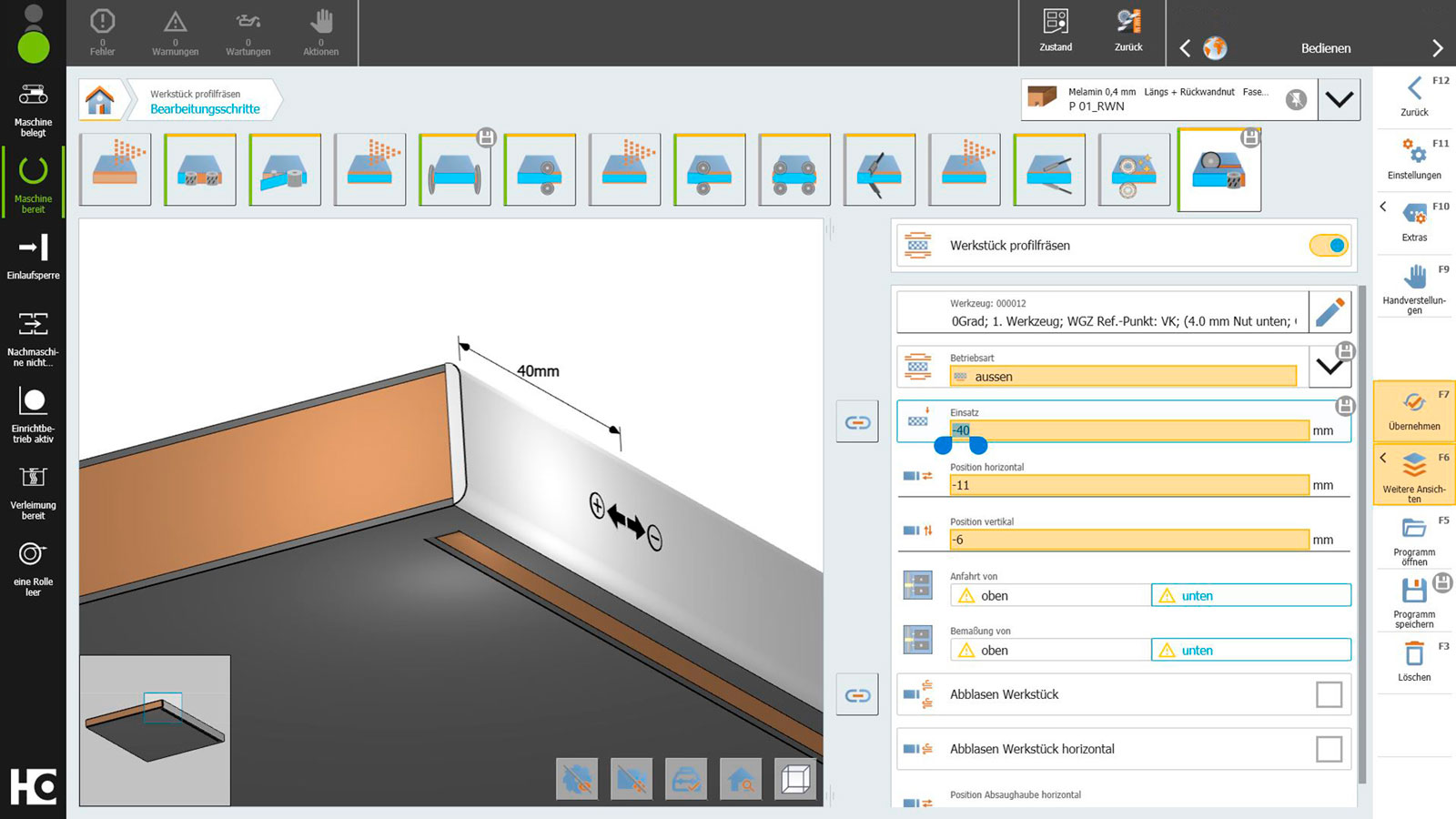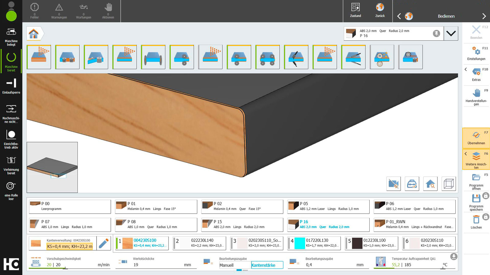 Software zur schnellen Auswahl der Bearbeitungsprogramme und des Kantenmaterials. Für sichere und schnelle Erfassung von Produktionsparametern sowie zum werkstückorientierten Erstellen von Maschinenprogrammen. Die neue Bedienplattform vereinfacht die Handhabung komplexer Maschinen durch Konsequente Digitalisierung und Vereinfachung der Bedienung, reduzierte Klicks mittels Programmverknüpfung und verbesserte Bedienerführung.