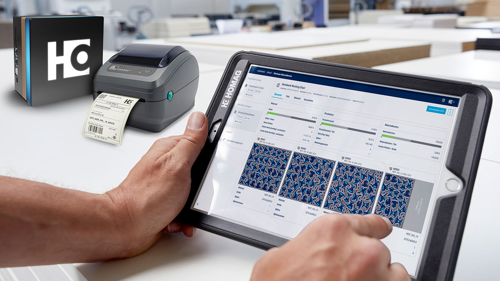 - Ist das Nestingprogramm abgearbeitet, wählen Sie den Nestingplan auf Ihrem Tablet an. Per Klick drucken Sie nun einfach die Etiketten einzeln für jedes Teil oder die Etiketten des gesamten Plans mit dem Etikettendrucker aus. Damit ist jedes Teil eindeutig identifizierbar und trägt alle wichtigen Informationen bei sich – wie z.B. den Auftragsnamen, Informationen zum Bauteil und zur Bekantung oder ein Barcode bzw. QR-Code für die weiterführende Bearbeitung.