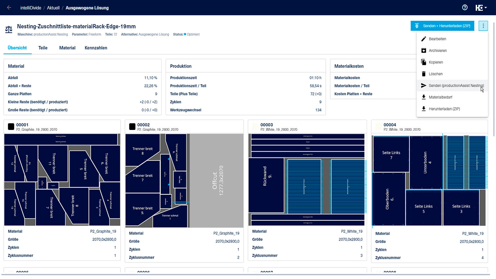 - Sie starten die Optimierung eines Auftrags mit der Optimierungssoftware intelliDivide Nesting in der Arbeitsvorbereitung im Büro. Anschließend laden Sie die automatisch berechneten Nestingpläne auf die Maschine. Gleichzeitig senden Sie die Pläne mit nur einem Klick an die App productionAssist Nesting auf dem Tablet in Ihrer Werkstatt.