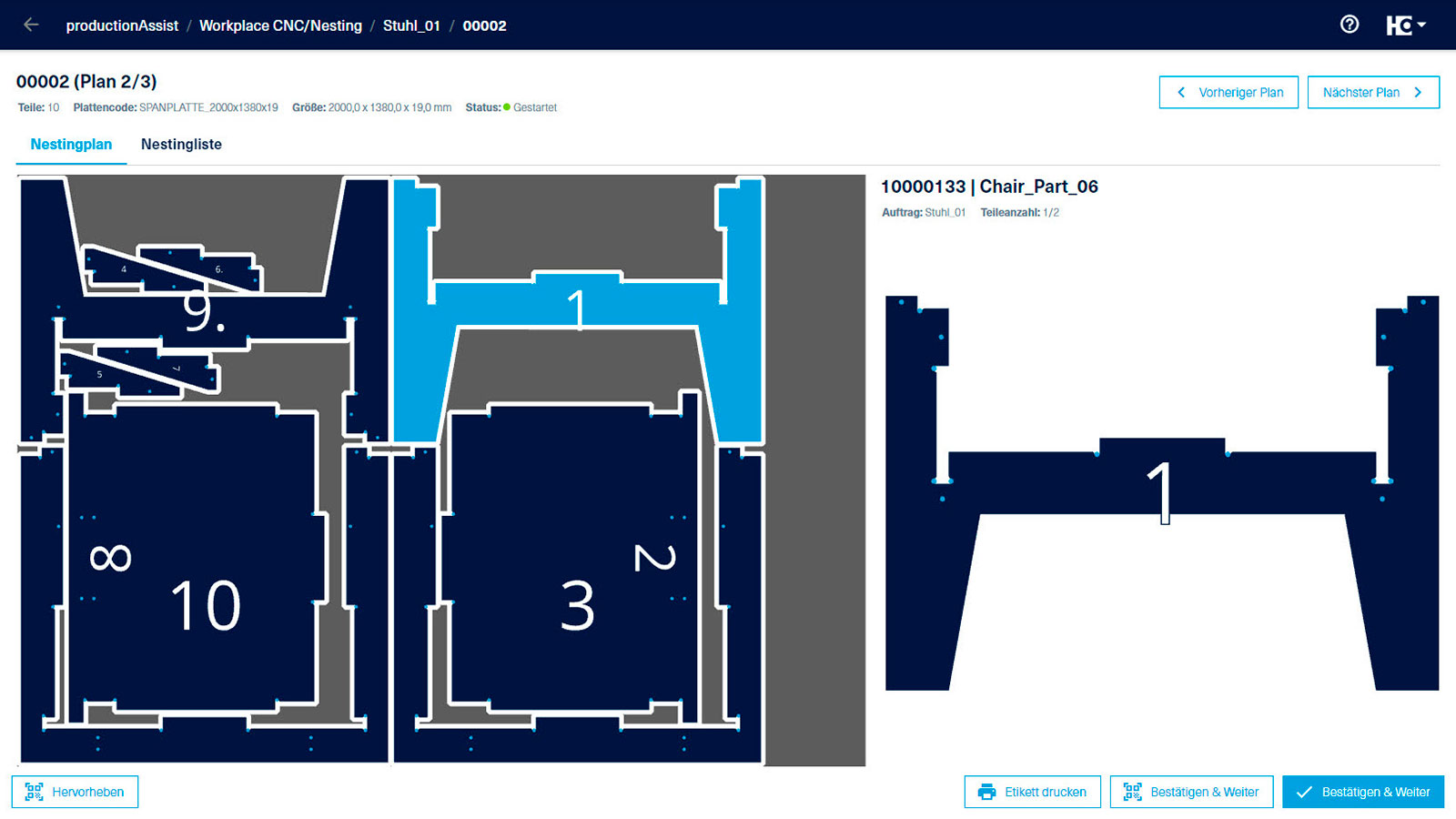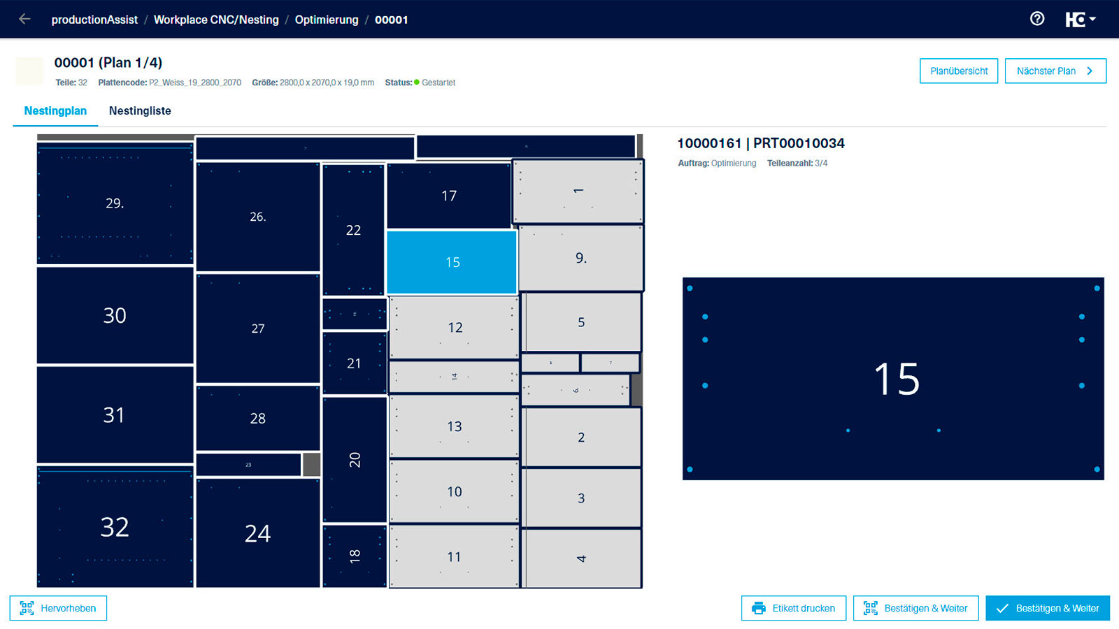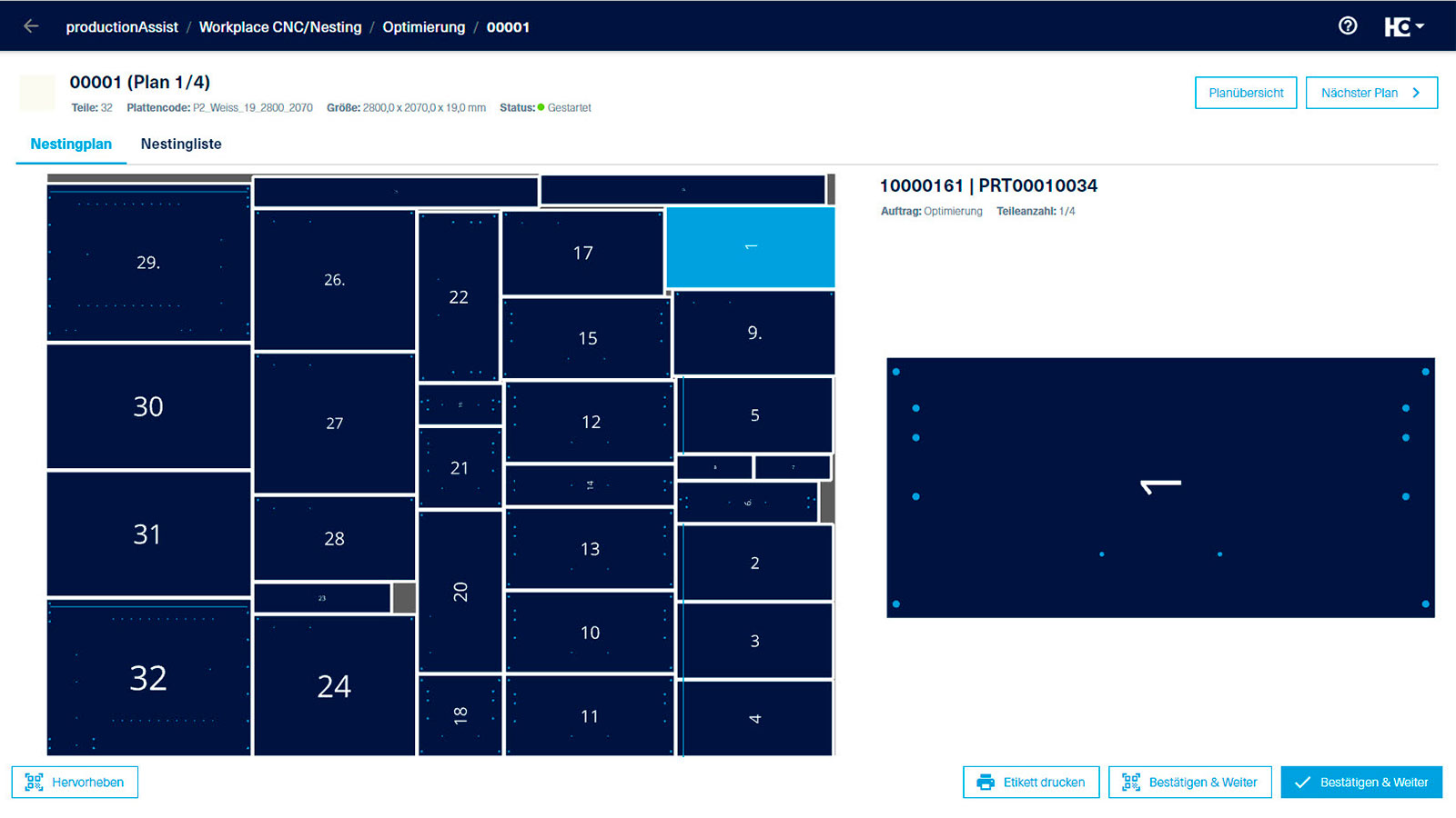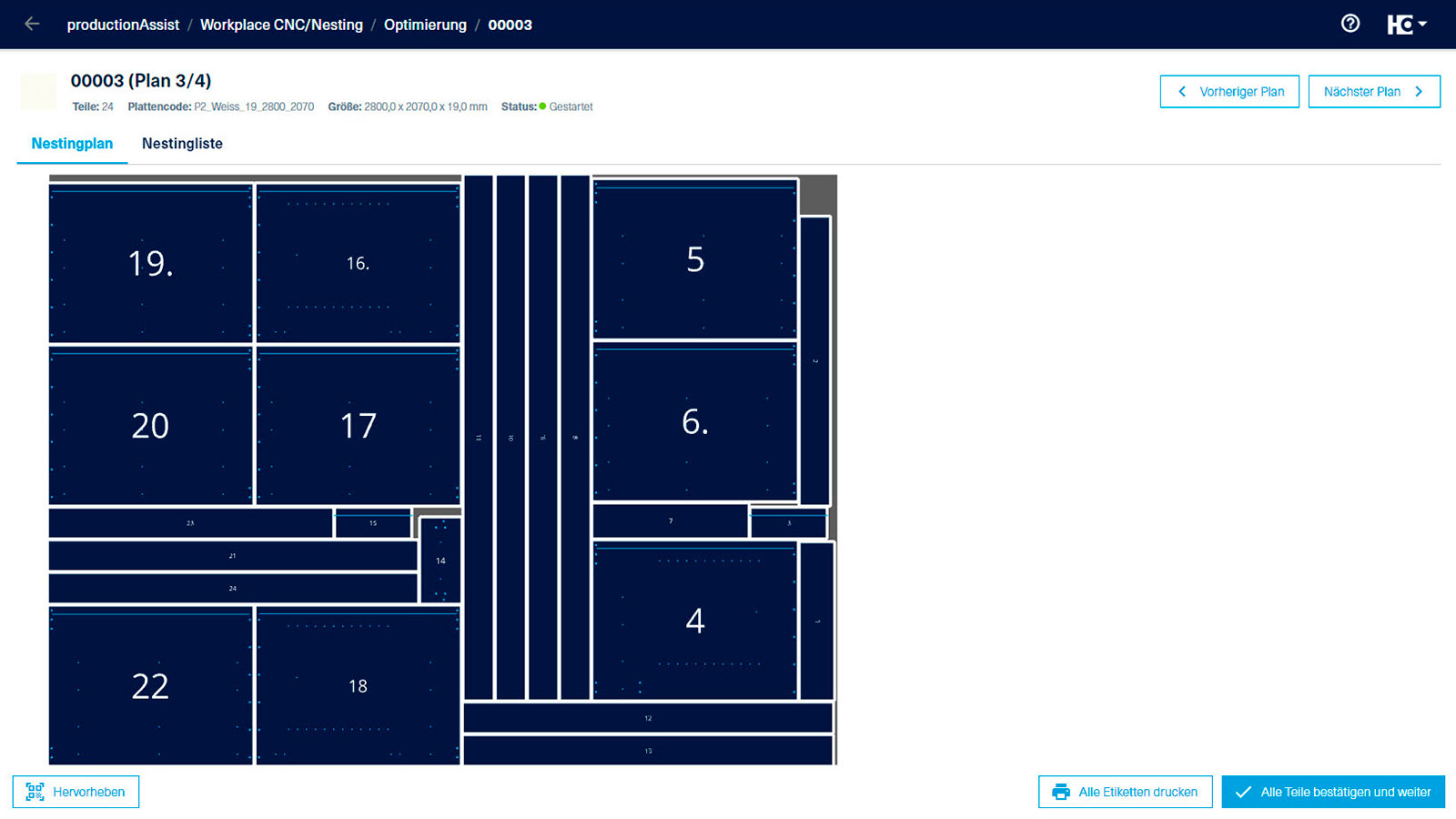 Unser Nesting-Assistent unterstützt Sie bei der automatischen Berechnung Ihrer Nestingpläne. Die Optimierungs-Software platziert dabei die einzelnen Bauteile im Nest möglichst nahe beieinander. So senken Sie spürbar den Materialverbrauch und sparen Kosten. Gleichzeitig drucken Sie für jedes genestete Teil ein individuelles Etikett und generieren schon an Ihrer Nestingmaschine die Basis für durchgängige Bearbeitungsdaten in Ihrer Schreinerei. Das Nesting Production Set ist die ideale Einstiegslösung für die Kennzeichnung Ihrer Bauteile und eignet sich perfekt für das Nachrüsten des Etikettendrucks an CNC-Maschinen von HOMAG.