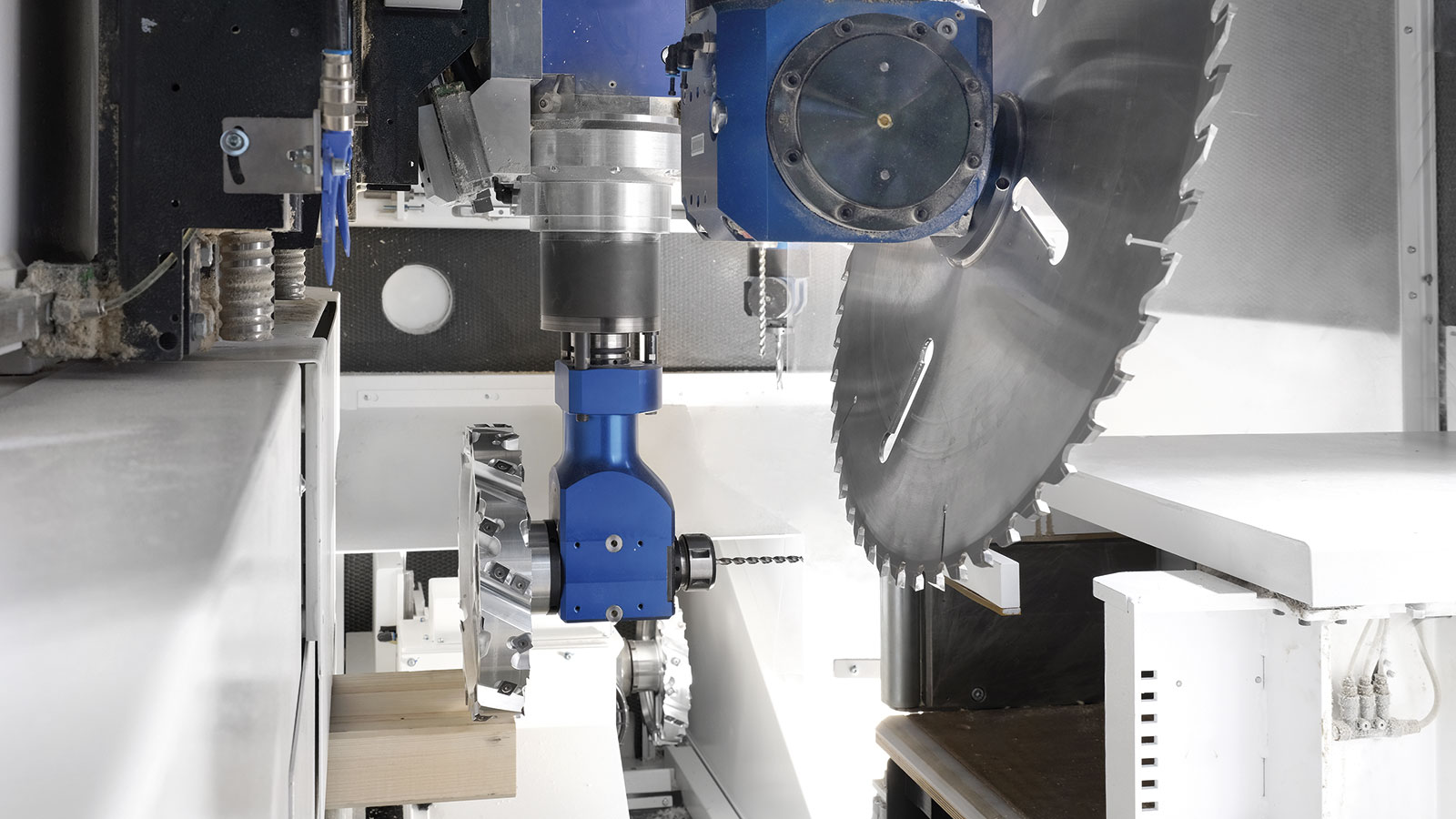 Unidade de serragem Flex5: Ângulo de rotação de 0 – 360° e ângulo de basculamento de 0 – 90° para a produção de cortes angulares, curvos, enviesados e longitudinais