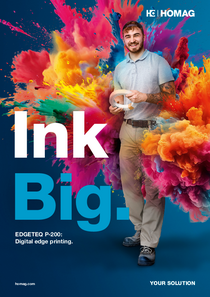 Padrões, decorações, imagens, logotipos, textos: a EDGETEQ P-200 revoluciona a colagem de bordas com uma impressão brilhante em quatro cores. Não há limites para a sua imaginação, então Ink Big (pense grande)! Seja em móveis, decoração ou construção de feiras (como estandes) - com slogans nas bordas dos balcões, padrões individuais em tempo recorde ou mogno em MDF, seus clientes ficarão impressionados! A EDGETEQ P-200 oferece limpeza automática das peças, um prático sistema de recarga de tinta e um quinto canal de cor para aplicação de verniz protetor. Por falar em pensar grande, a máquina imprime componentes de até 2500 mm de comprimento, 700 mm de largura e 38 mm de espessura.