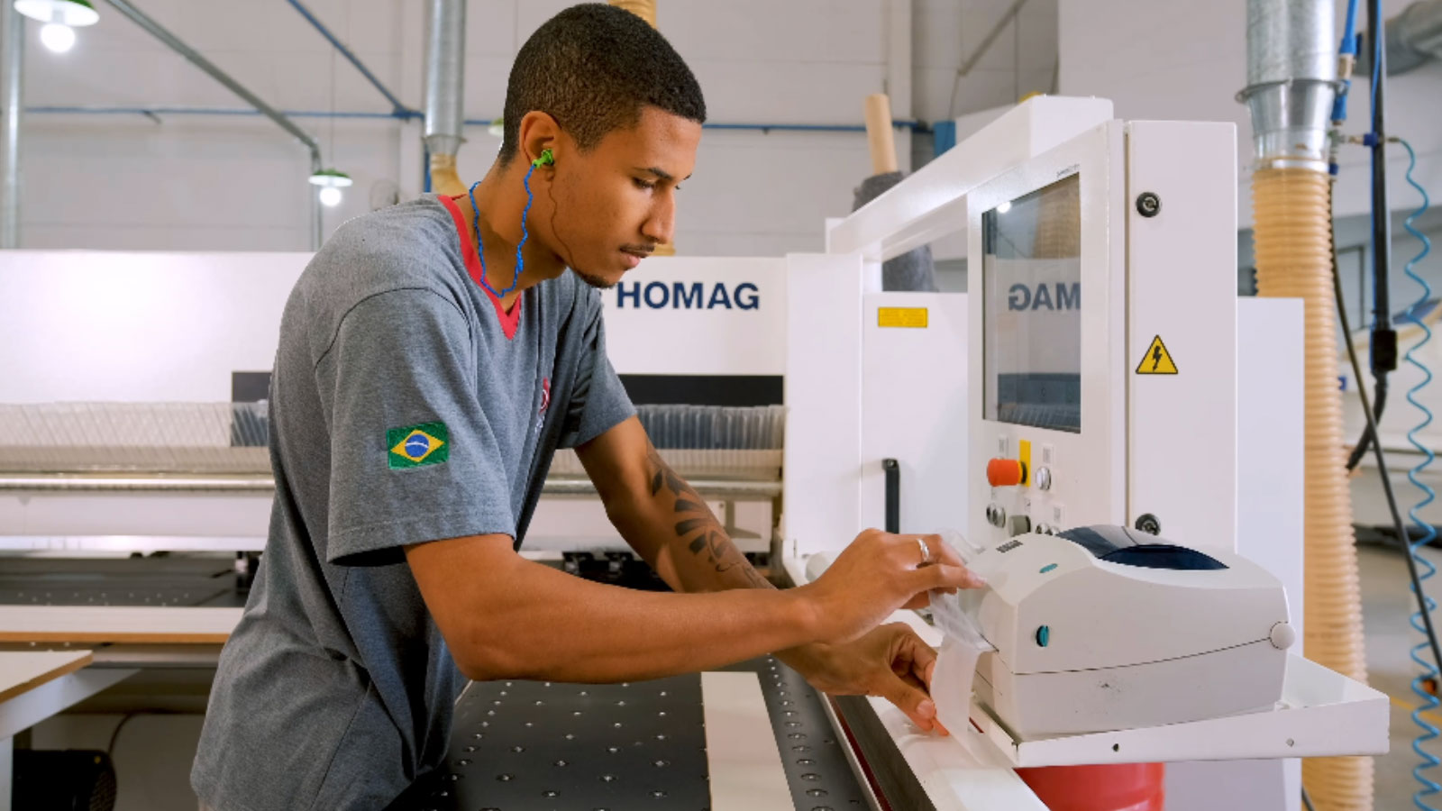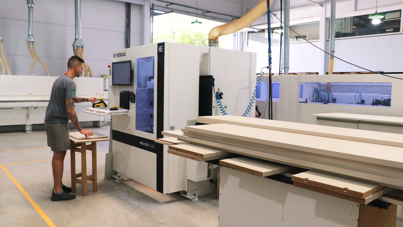 Desde o início que nós apostamos na primeira máquina da HOMAG, a Coladeira de Borda, nos posicionou como uma empresa de muita qualidade. Após essa etapa, apostamos na segunda máquina: a Seccionadora, que nos deu muita produtividade e qualidade. E a nossa terceira e última aquisição também HOMAG, porque já sabíamos que as máquinas eram sensacionais, foi o Centro de furação e usinagem, que nos permitiu acelerar ainda mais a nossa demanda e fazendo com que pudéssemos compor um móvel perfeito.