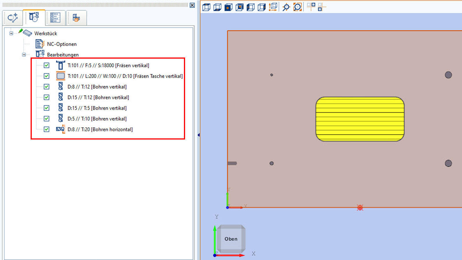 - 3D-Grafik von Werkstück, Bearbeitungen und Spannmitteln