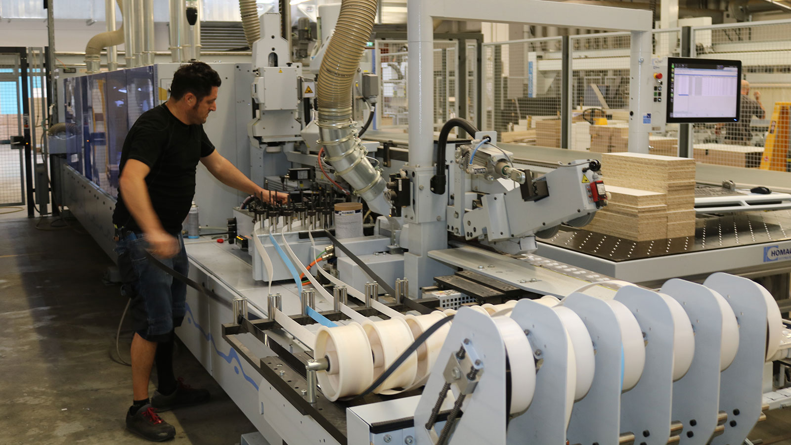 Ein Sechsfach-Kantenmagazin gibt genügend Spielraum in der Kantenauswahl – von Furnier über HPL bis ABS. Alle Bearbeitungsaggregate werden vollautomatisch eingestellt, die Erfassung aller Maschinenzustände erfolgt ebenso automatisiert. Es bedarf kaum einer Erwähnung, dass die Steuerung – wie beim Lager auch – über Powercontrol PC 23 Powertouch erfolgt. Bedeutend ist weiterhin die an der Kantenanlage installierte Portalrückführung TFU 521 mit Umsetzer, Dreh- und Abstapelstation. Denn damit hat ein Mitarbeiter allein die gesamte Kantenvergütung „im Griff“.