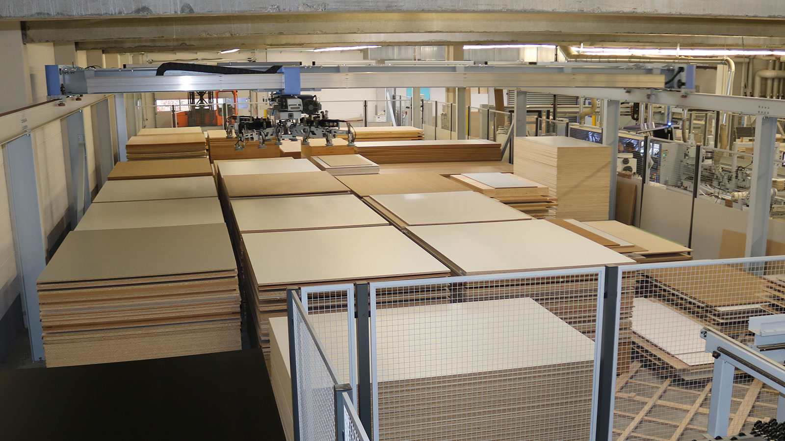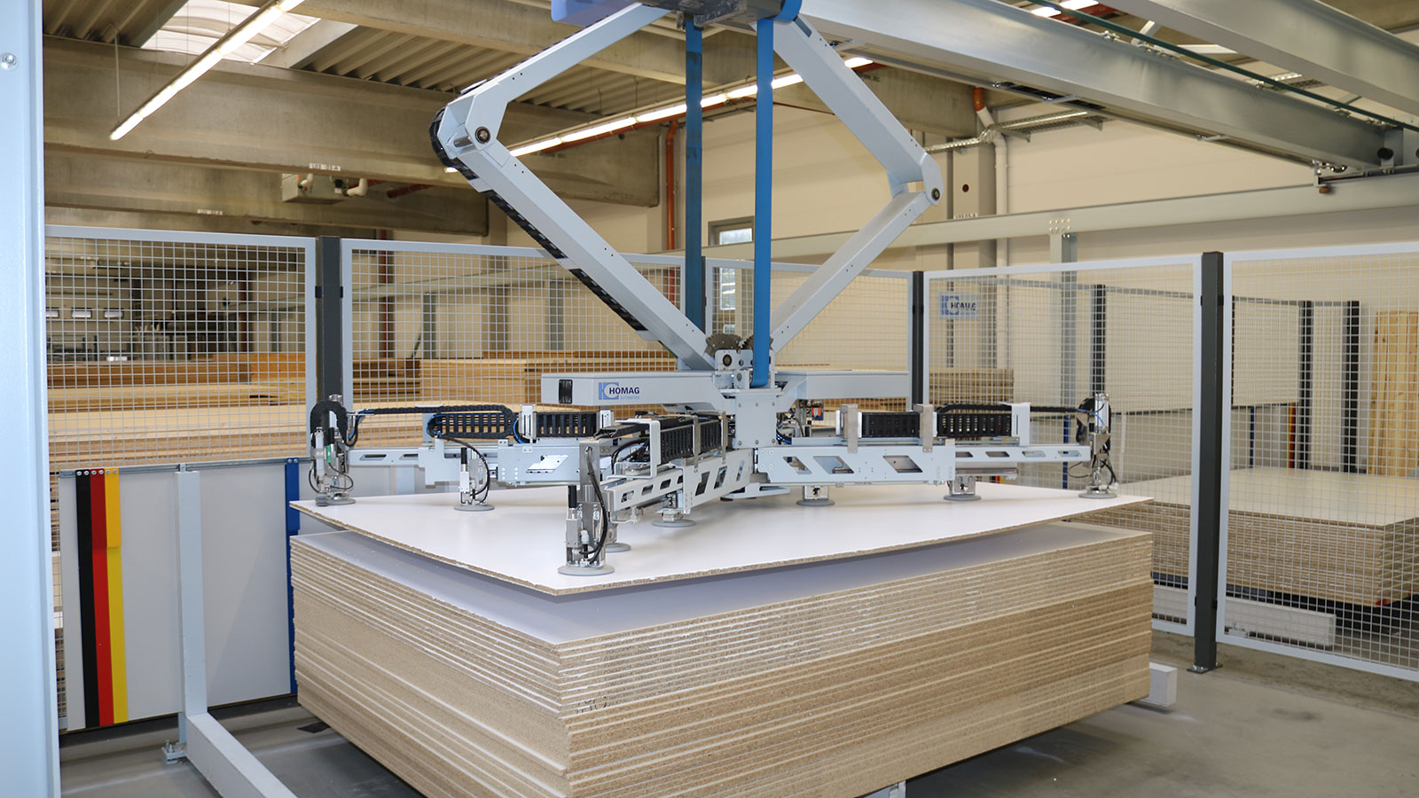Ebenfalls nur ein Mitarbeiter managt das vorgelagerte, vollautomatische Flächenlager TLF 411. Auf einer Nutzfläche von 38 m Länge und 10,7 m Breite organisiert die Lagersteuerung „Woodstore“ über Barcodes die Lagerung von Platten von 12 bis 40 mm Dicke. Auf 45 Lagerplätzen entstehen chaotisch aufgesetzte Rohwarenstapel bis 2,10 m Höhe, was gleichbedeutend mit maximal 4.500 Einzelplatten ist. Nicht zu vergessen: Auch das Restehandling erfolgt vollautomatisiert als Teil der Lagerlogistik. Bemerkenswert ist das fein justierte Ansaugsystem, dessen sensibel angesteuerte Sauggreifer ein unkontrolliertes Aufnehmen mehrerer Platten verhindern.
