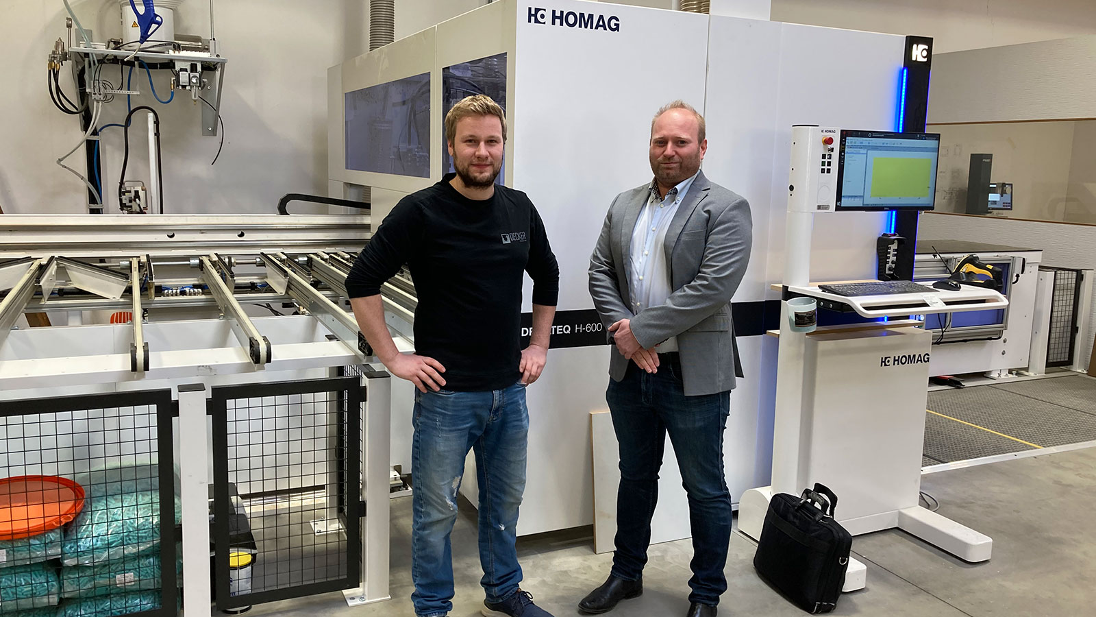 Martin Decker (links) und Stefan Niederacher (Sales Director HOMAG Austria) vor der HOMAG DRILLTEQ H-600