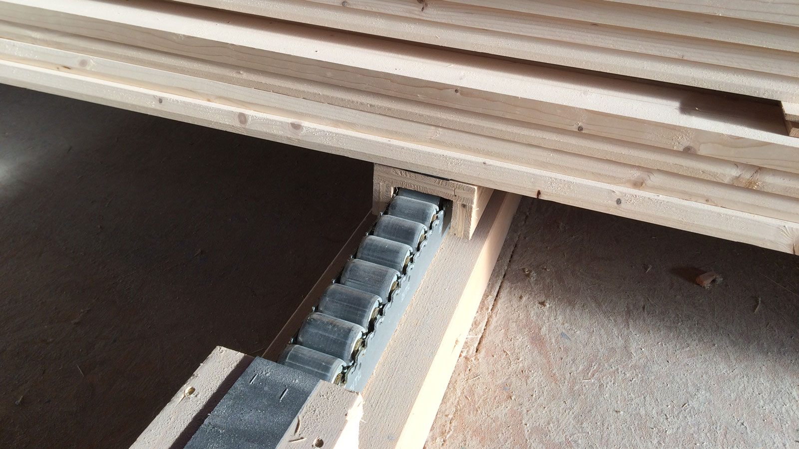 Die Effizienz in der Produktionshalle, ob für den Elementbau oder für den Abbund, fällt bei einem Wechsel von einem Bauvorhaben zum nächsten deutlich ab. Auch der Wechsel von einem Wandaufbau zu einem anderen, am selben Tisch, hat einen Effizienzverlust zur Folge. Die verlorene Wertschöpfung während des Umrüstens kann nicht mehr aufgeholt werden. Die Problematik entsteht dann, wenn das alte Material aus der Halle raus und das neue rein muss. Sind die Platzverhältnisse eng, werden die Materialien mit dem Hallenkran getauscht und in eine Ecke gestellt. Der Hallenkran ist allerdings das langsamste Transportmittel. Während des Materialtauschs stehen schnell mal drei, vier Mitarbeiter herum und schauen nur zu.