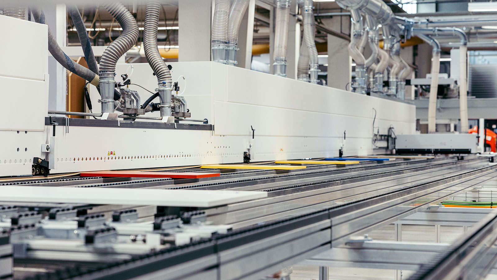 Beide Linien sind parallel angeordnet und werden von einem gemeinsamen Plattenlager versorgt – einem Portallager auf zwei Ebenen, das eine Kapazität von circa 4.500 Halbformatplatten bietet und über chaotische und Starkläuferplätze verfügt. In der Einzelfertigungslinie werden Kleinteile erst auf einer Plattensäge mit manueller Bedienung zugeschnitten, wo hali aufgrund der Inselfertigung noch etikettiert. Von der Säge gehen die Teile dann an eine ältere Kantenanleimmaschine oder eine neue EDGETEQ S-810 samt einer Rückführung LOOPTEQ C-500, mit der sich auch Kleinteile bekanten lassen.
