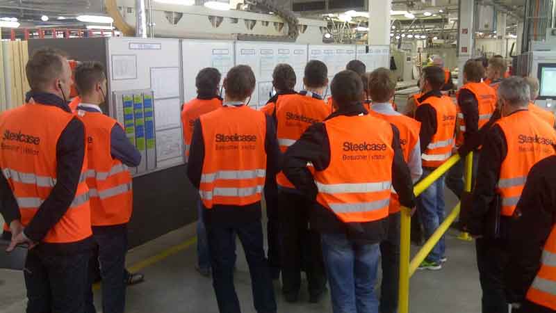 Rückblickend auf die 11 Jahre seit dem Start der LEAN Produktion sind beim Büromöbelhersteller in Rosenheim viele Projekte und Veränderungen zur Fließfertigung umgesetzt worden. Interessant war, dass die ersten Lean-Aktivitäten nicht gleich zum Ziel führten, sondern dass erst nach Einbezug von erfahrenen Lean- Experten von Steelcase USA das Projekt zum Erfolg wurde. Die exakte Produktionssteuerung und Fertigungsreihenfolge ermöglicht es, dass aus den drei Fertigungsbereichen die Waren synchron in der Endmontage eintreffen. Mit relativ geringen Puffern von nur etwa 4 Stunden zwischen den Prozessen konnte eine geringe Durchlaufzeit realisiert werden. Diese gibt Steelcase als Vorteil an seine Kunden weiter. Die Lieferzeiten für auftragsbezogene Möbel wurden auf 12 Tage(!) reduziert. Steelcase hat sich jedoch bereits ehrgeizigeren Zielen verschrieben und möchte die Durchlaufzeit noch weiter senken. Steelcase visualisiert eindrucksvoll in seiner Produktion alle Lean Aktivitäten, TPM Instandhaltung und SMED Rüstworkshops. Mit Sicherheit ist Steelcase eines der Paradebeispiele für eine erfolgreiche Lean-Einführung in der Möbelindustrie. Dass die Firma dennoch so offen mit Ihrem Know-how umgeht, hat die Unternehmergruppe sehr gefreut.