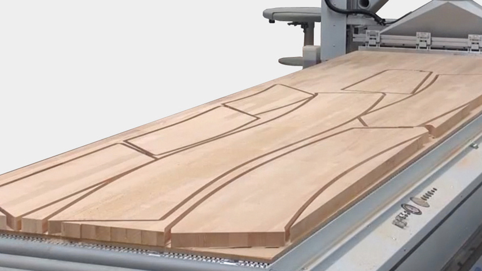 Bis zu 1.400 Treppen produziert die Firma aus Mecklenburg-Vorpommern im Jahr. „Das Volumen ist in etwa gleich wie vor fünf Jahren. Allerdings hat sich der Anspruch der Kunden geändert“, erzählt der Geschäftsführer. Mittlerweile kümmern sich vier Konstrukteure um die Umsetzung der Kundenwünsche. Oft sind auch knifflige Fälle dabei. Um eine Lösung verlegen ist man in der Hansestadt allerdings nie – auch dank der ausgefeilten Maschinentechnik von Homag. „Eigentlich ist der Einsatz einer Nestingmaschine in mittelständischen Betrieben, die spezielle Kundenwünsche realisieren, eher ungewöhnlich. Man findet sie zumeist bei Firmen, die Standardtreppen in hohen Volumina fertigen. Bei Plath funktioniert das aber bestens“, findet Friedhelm Rempp, Senior Manager Produktmanagment und CNC-Technik bei Homag. Das Arbeiten mit der BOF211 zahlt sich für den Treppenbauer aus. Die Software übernimmt die Verschnittoptimierung von allein und schlägt dem Bediener eine Standardverschachtelung vor. Er kann dann dem Vorschlag folgen oder die Arbeit manuell beeinflussen. Die flüssigkeitsgekühlte 4-Achs-Frässpindel hat eine kräftige Leistung. Dank des zwölffachen Tellerwechslers liegen die Span-zu-Span-Zeiten unter 10 s. Der Arbeitsbereich beim Umfräsen liegt bei 5 375 mm in der X- und 1 550 mm in der Y-Richtung. Die einzelnen Bauteile werden anschließend auf einer separaten Linie gerundet und geschliffen. Das alles geschieht hochgradig integriert in den weiteren Arbeitsablauf bei Treppenbau Plath.