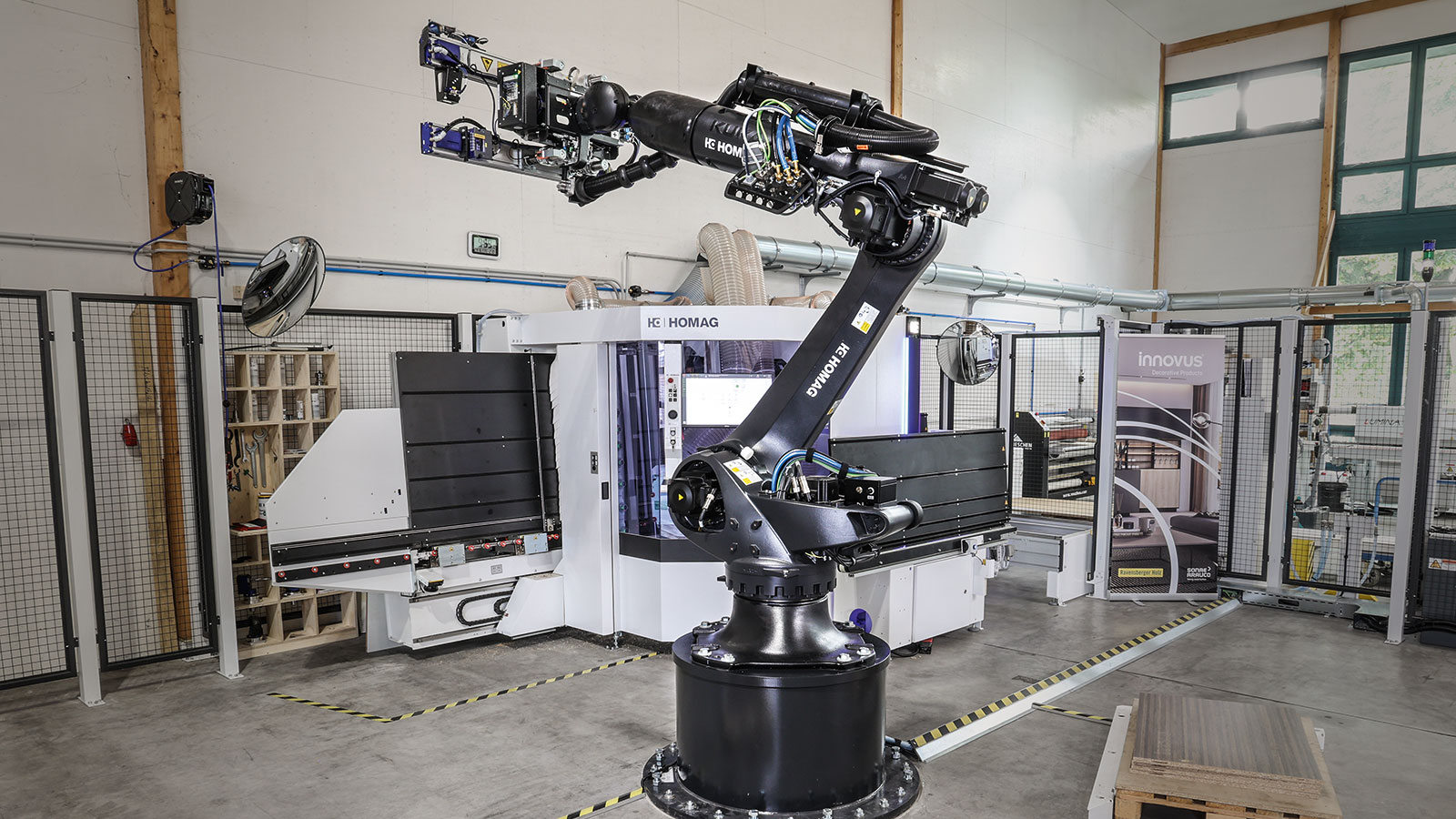 Der Betrieb nutzt die Maschine hauptsächlich zur Bearbeitung von Korpussen und Fronten sowie zur flexiblen Anpassung von Türen. In der Praxis zeigen sich die Vorteile der Zelle besonders in der guten Prozessintegration des Roboters: Ohne eigene Steuerung und Programmierung lässt er sich direkt über das Bearbeitungszentrum bedienen.